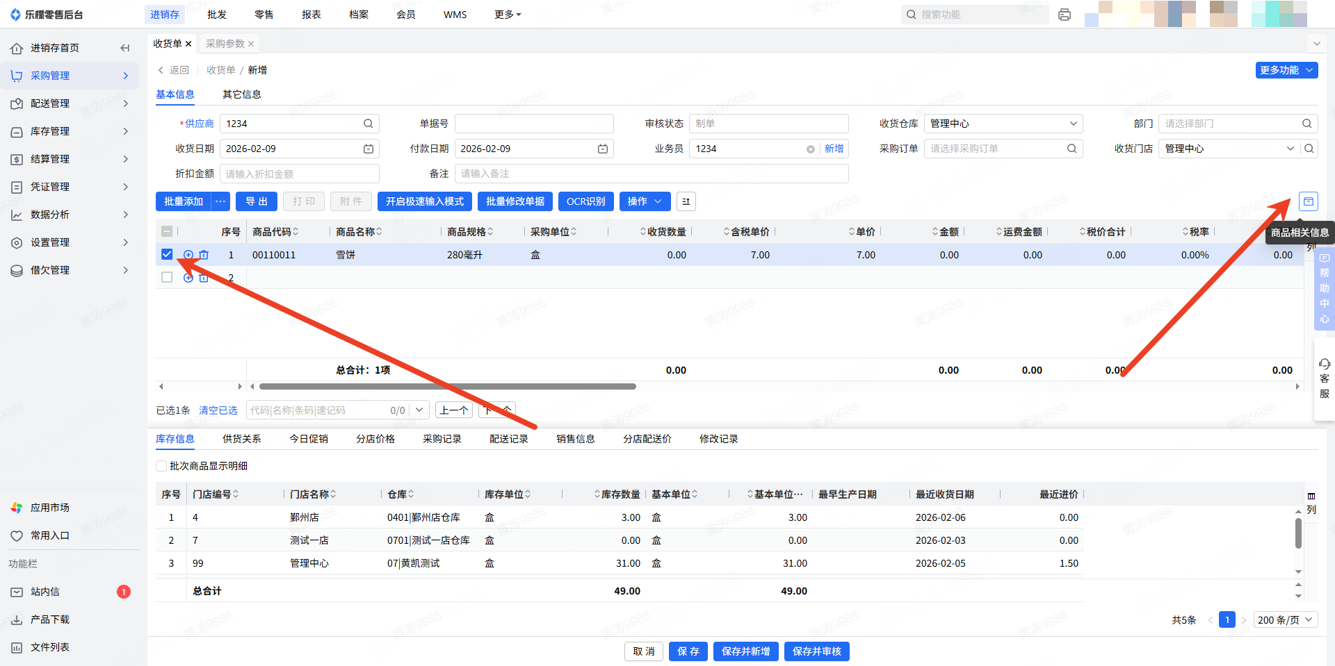 2.填写供应商、收货门店、收货仓库,依次录入对应供应商信息,选择收货门店与收货仓库;收货门店默认匹配当前登录门店,若登录门店为管理中心,可手动修改为其他门店;若收货门店下存在多个仓库,收货仓库支持下拉选择。