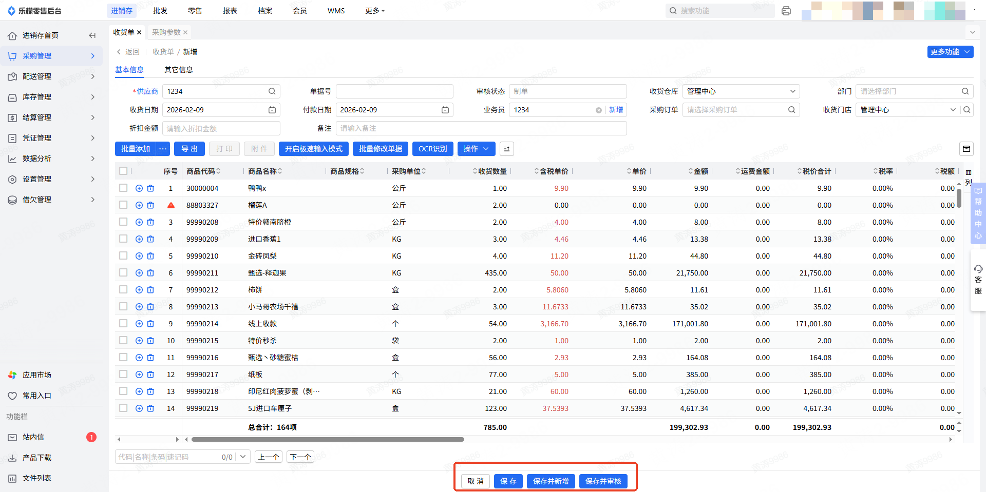 5.全部商品录入完成后,可进行保存或者审核处理。