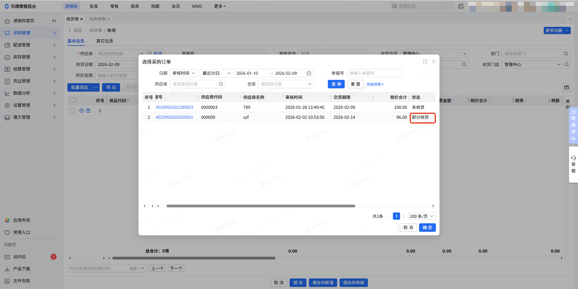 4.部分收货订单的二次收货处理,关联采购订单收货时,若商品未全部收齐,该采购订单在采购收货模块的单据状态将显示为部分收货;若同一采购订单需继续收货,可再次选中该采购订单,对剩余未收货商品完成后续收货处理。