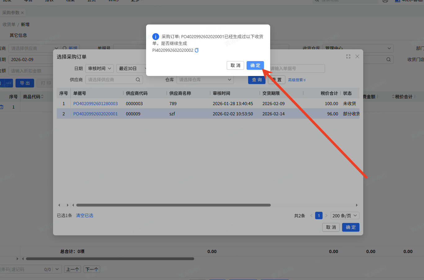 2.选择需要进行收货的采购订单生成收货单