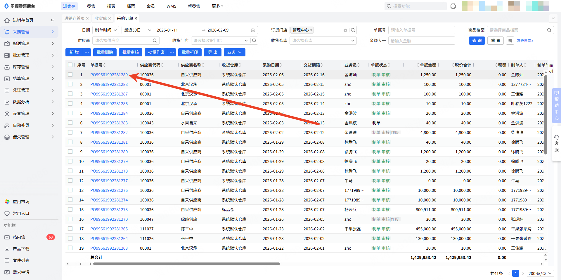 1.点击采购订单单号—转收货单