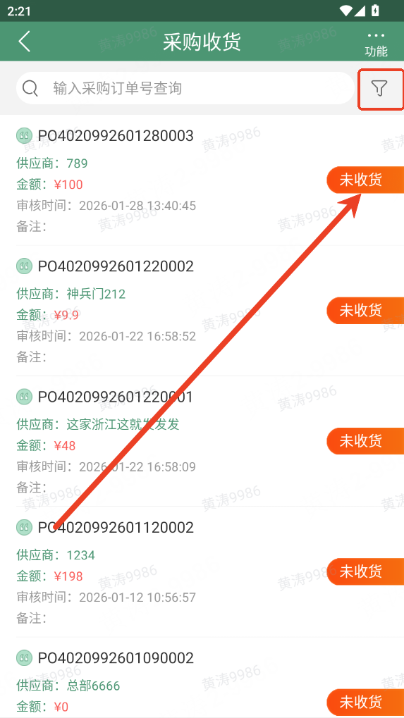 1.采购收货 - 采购订单选择点击页面右上角筛选器图标,可按日期、供应商、商品、收货门店多维度筛选采购订单;找到目标采购订单后,点击单据即可进入收货清单明细页面。