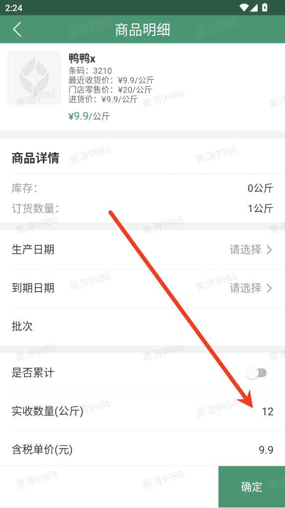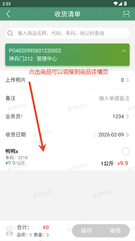 2.核对收货商品明细,按实际到货情况核对商品的数量、单价、金额;未到货商品无需勾选,需调整数量 / 价格的商品,点击对应明细项进入商品明细页,修改实收数量与单价即可。