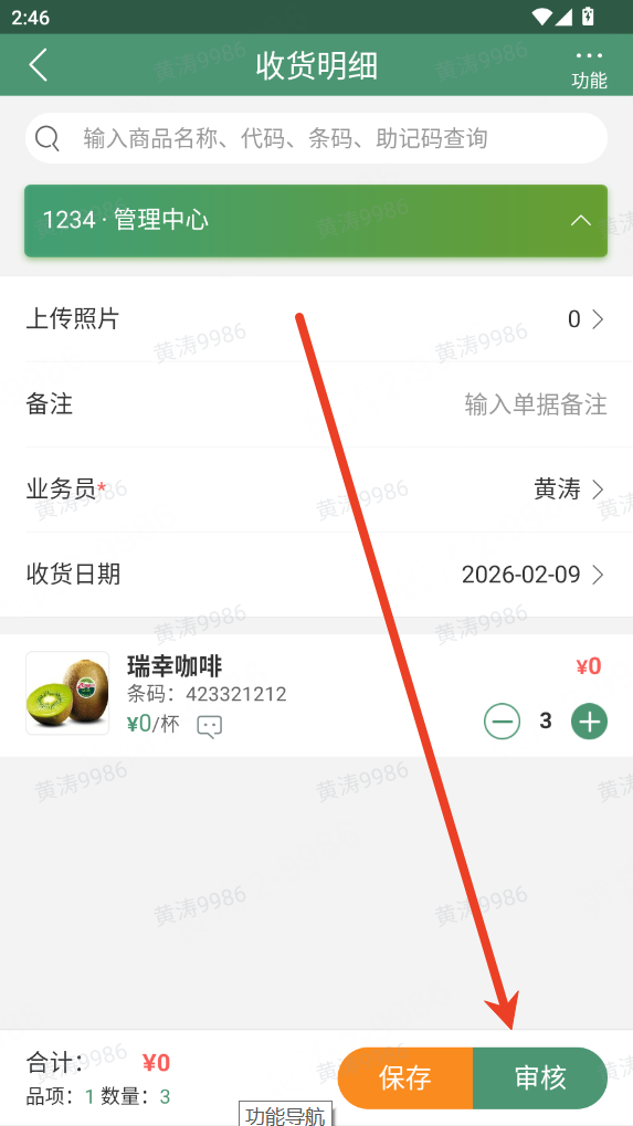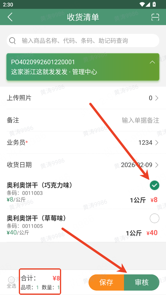 3.商品核对,核对完成后,确保已收货商品均勾选、未到货商品未勾选,点击【审核】完成收货流程,系统将自动增加对应商品库存;若暂不完成收货,可点击【保存】,单据数据将留存于收货单中,支持后续二次编辑。