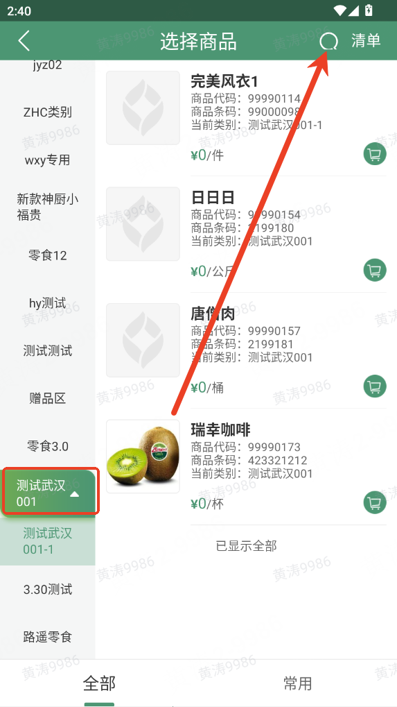 (2)输入 2 个字及以上关键字,可模糊匹配商品名称、商品代码、商品条码;输入完整的商品代码 / 条码 / 商品名称并回车,即可实现精确搜索。