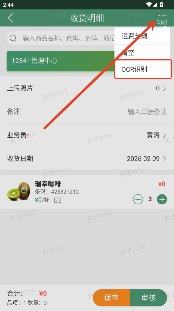 选择商品页点击右上角【清单】,进入收货明细页后,点击功能按钮即可启用OCR 识别功能,具体操作方法可参考:https://lemeng.dochelp.cn/d/1813781188399136769.html