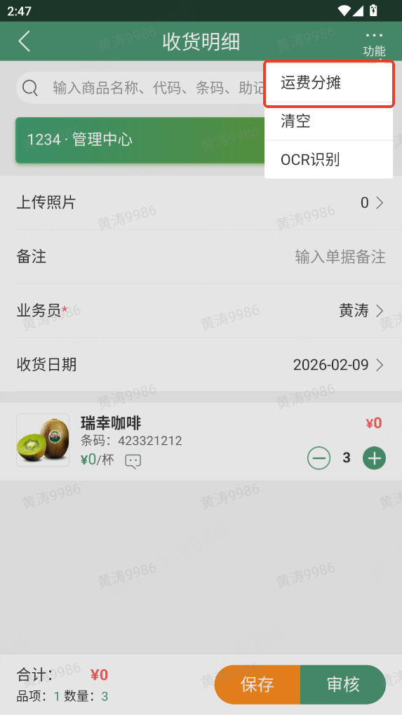 在商品选择页点击右上角【清单】,进入收货清单页核对商品明细,确认无误后点击【审核】,系统将自动增加对应商品库存;页面右上角【更多功能】支持单据运费分摊,可按金额、采购数量、基本数量规则,将运费分摊至各商品。