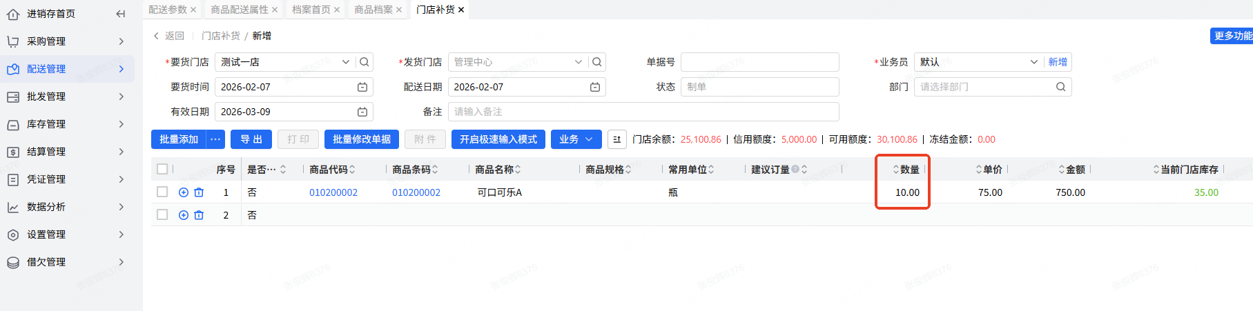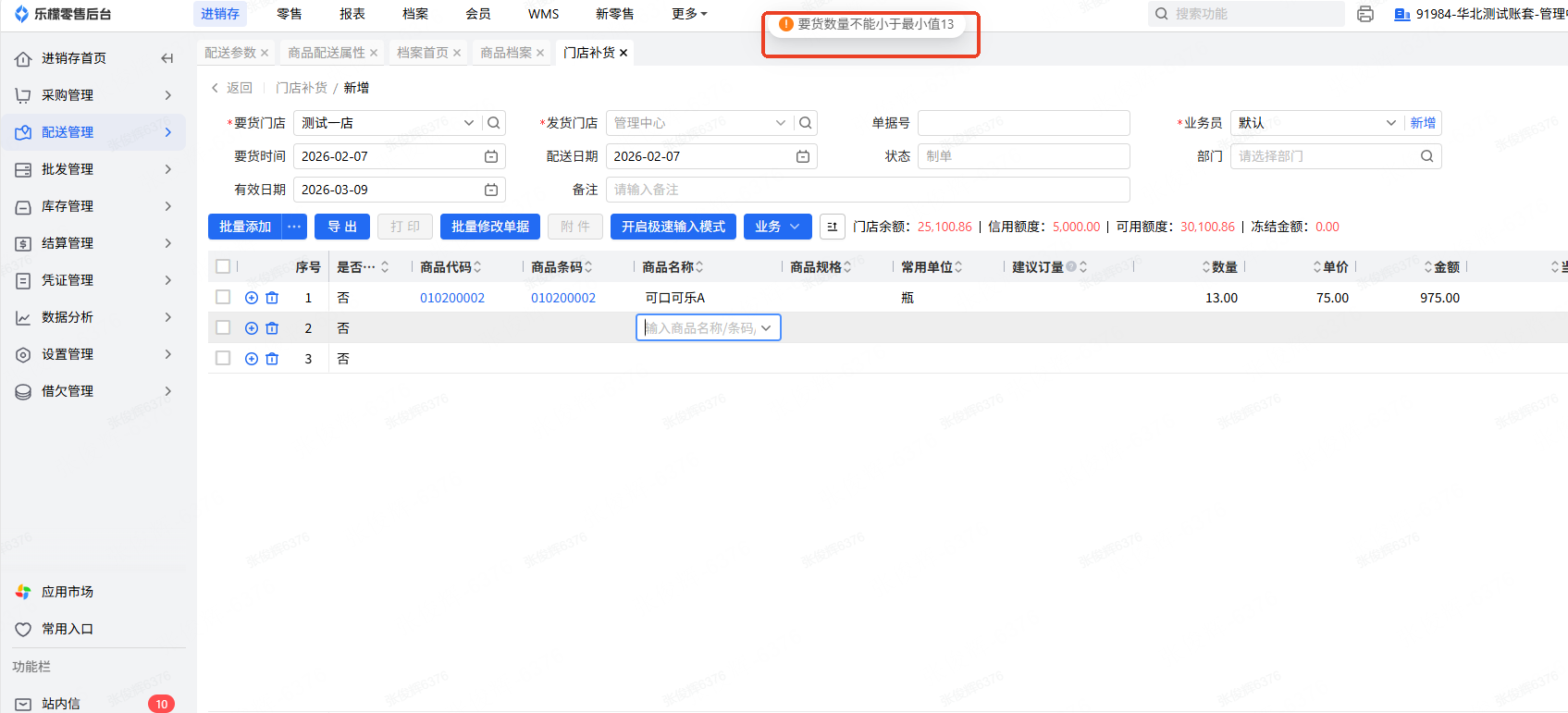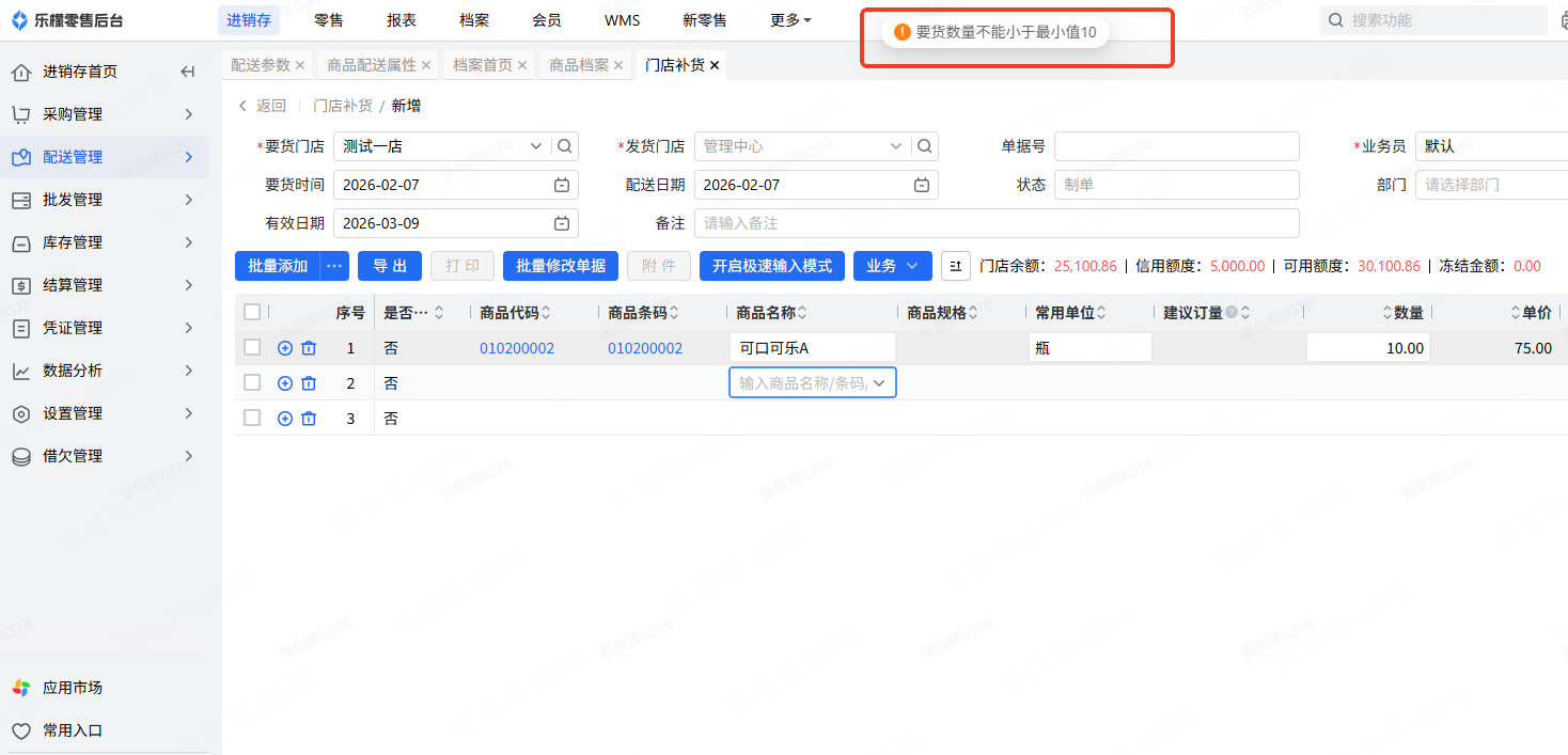2、门店要货,要货数量不符合配送属性设置下限和基数时,页面提示