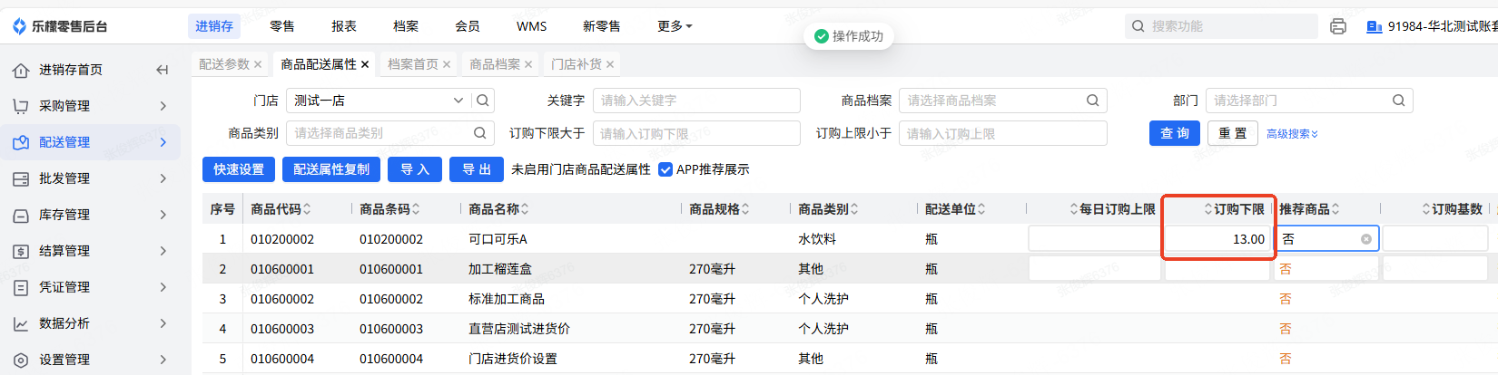 商品配送属性的功能是设置商品的订购数量的上限和下限,并设置是否未推荐商品;或者由于加盟店位置,大小等因素,要货时也会有差异。例如面积大的店要货量就大于面积小的店。开启该参数后,各个门店可以单独设置商品的要货属性,以满足不同的门店要货情况。