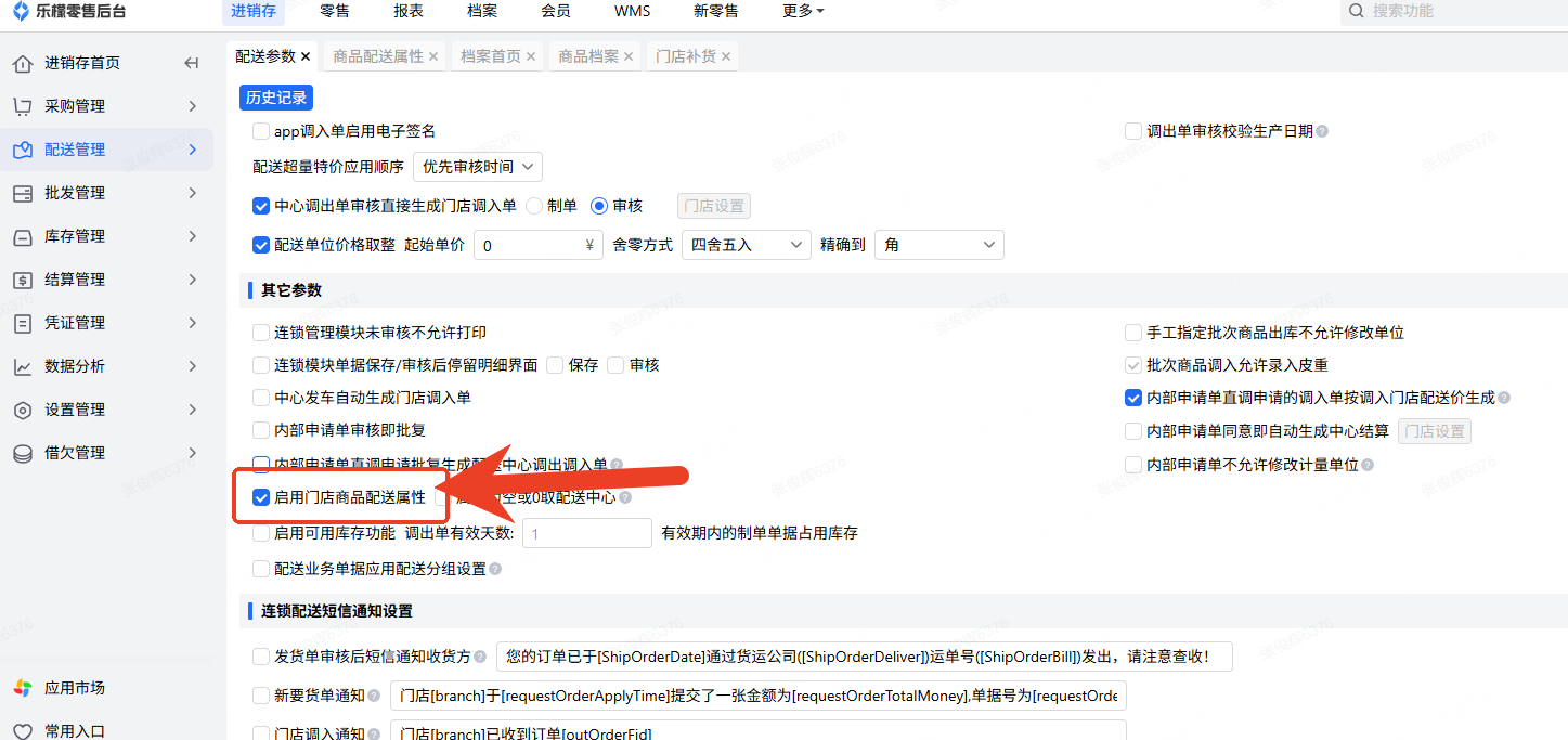 开启启用门店商品配送属性参数,门店要货应用门店自己的门店商品配送属性