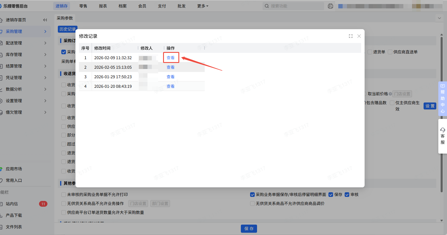 查看采购参数修改的历史记录