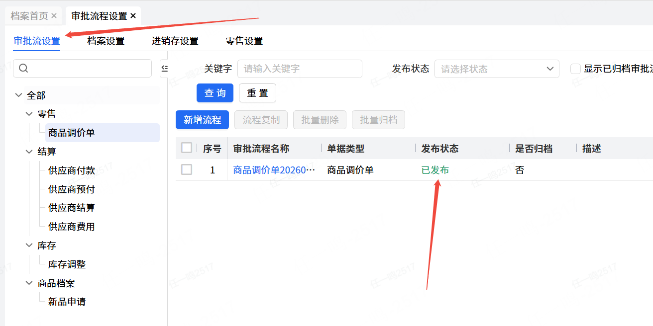 前置条件:需在审批流设置tab页中,新增“商品调价单”的审批流,且审批流是已发布状态