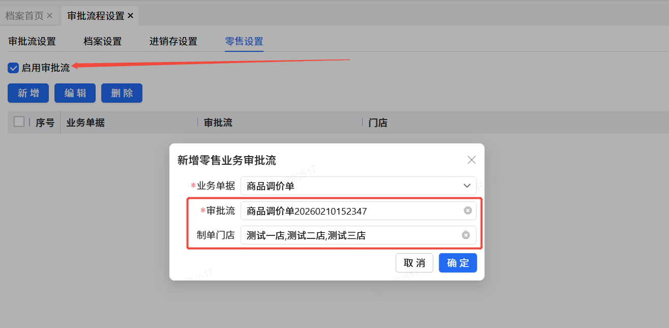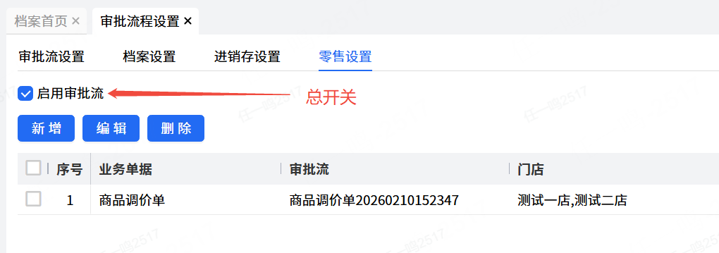 1、“启用审批流“按钮是总开关,关闭后,整个零售设置内的审批流程都不可用