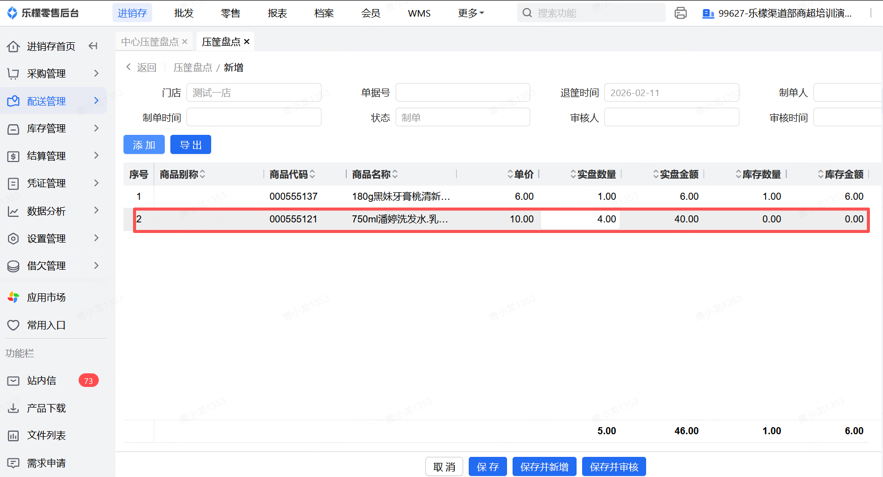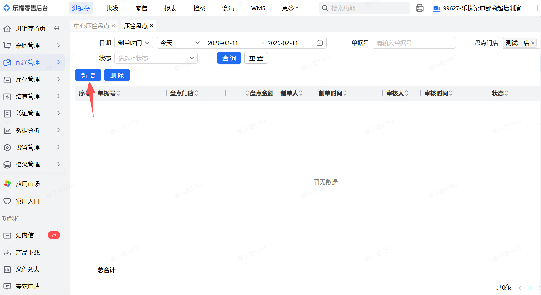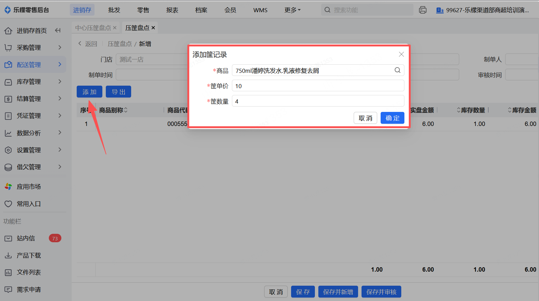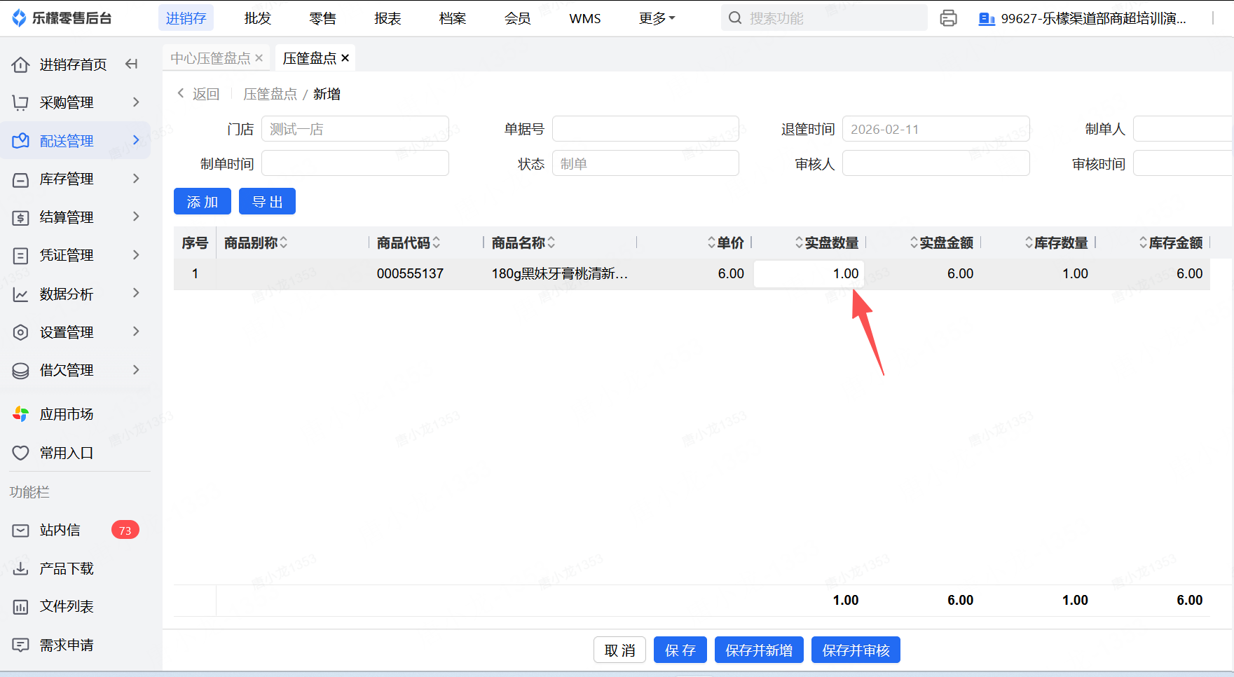 👉【操作路径】:进入后台配送管理—选择压筐盘点—新增—会自动出现需要盘点的筐数量和对应的商品—输入盘点数量