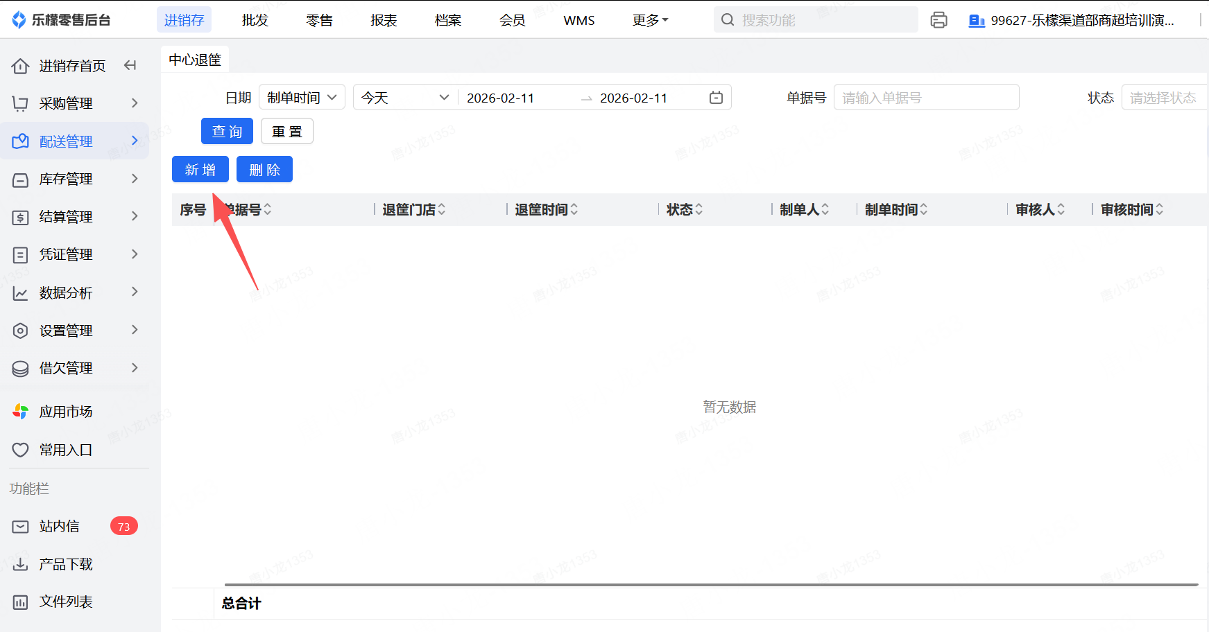 👉【操作路径】:进入后台配送管理—选择中心—新增—选择供应商后会自动带出明细—输入退筐数量—保存审核