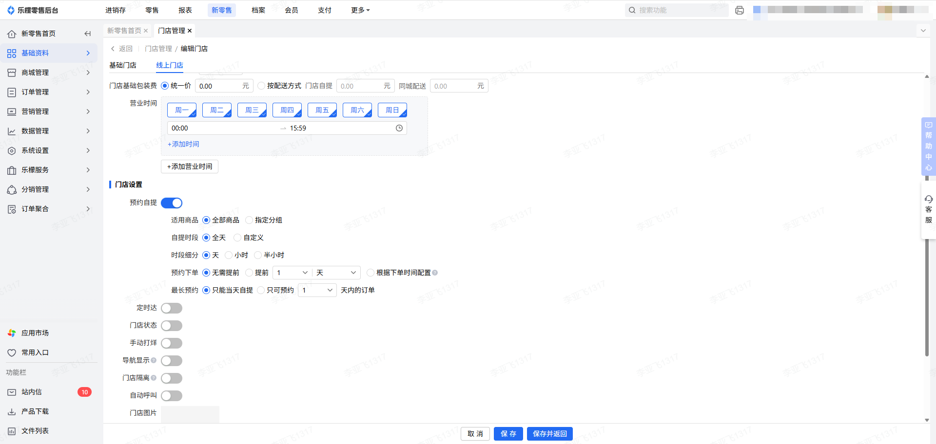 线上小程序的门店配置门店对外展示、订单交易、配送 / 自提、预约及营业状态等基础规则,支持商家灵活设置门店信息、费用、营业时间、预约自提、定时达、门店状态,实现线上订单履约与门店运营标准化管理。