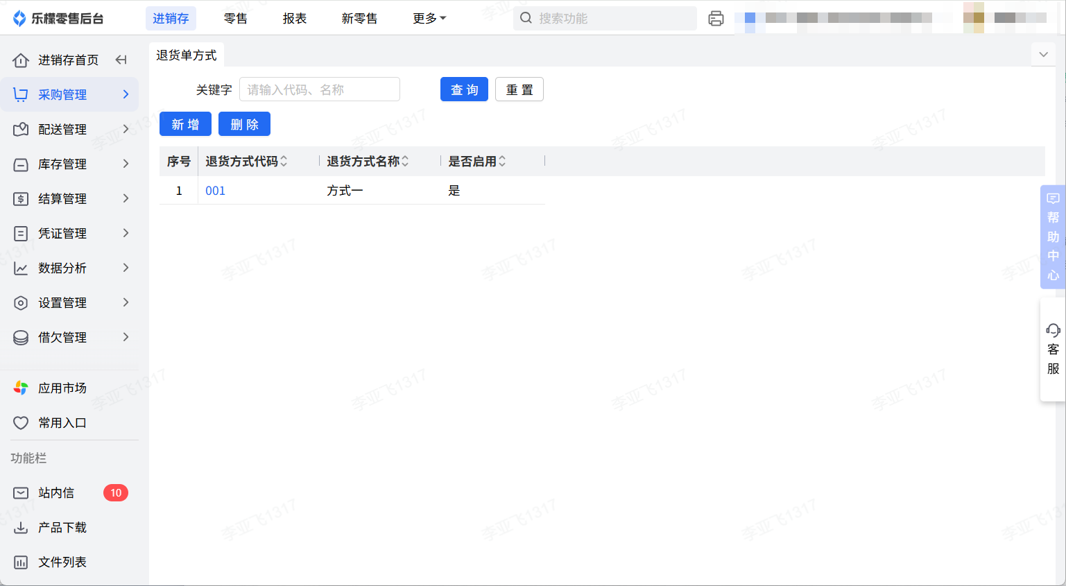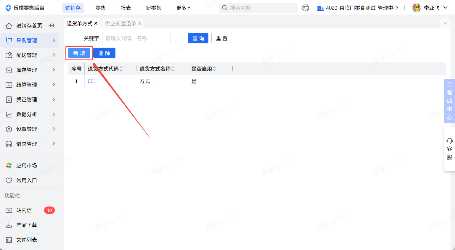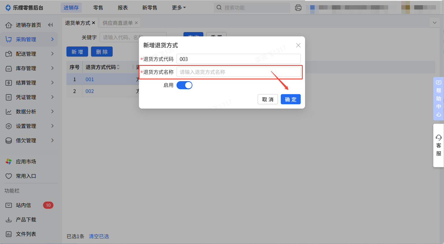 2、填写退货方式名称,点击确定