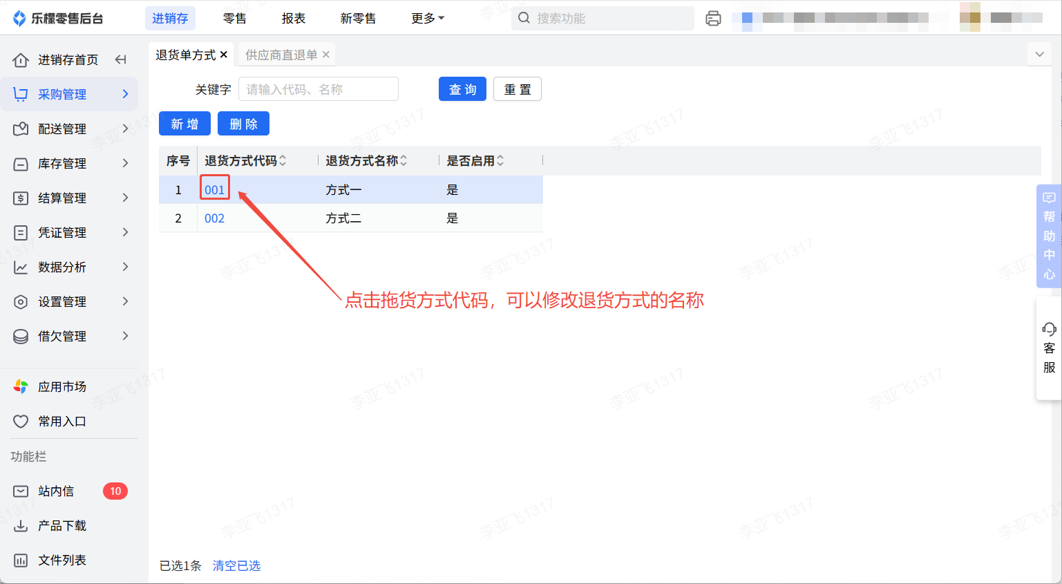 3、创建好退货方式后,在做退货单时即可选择