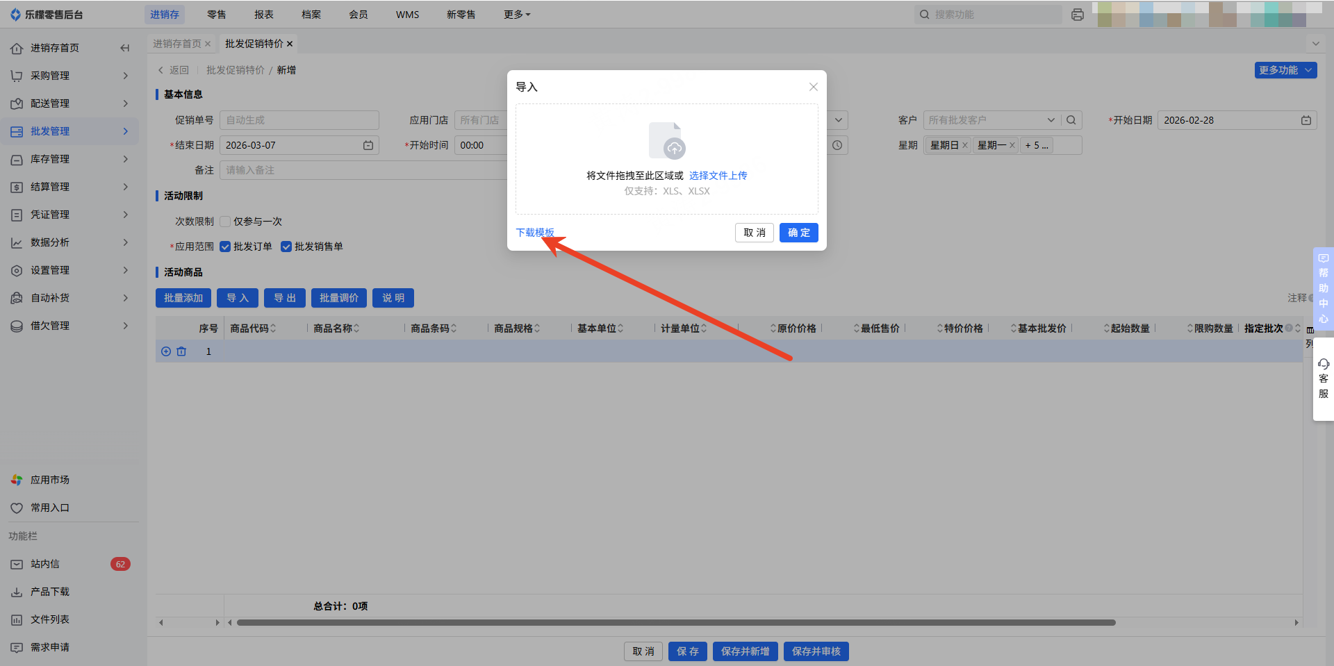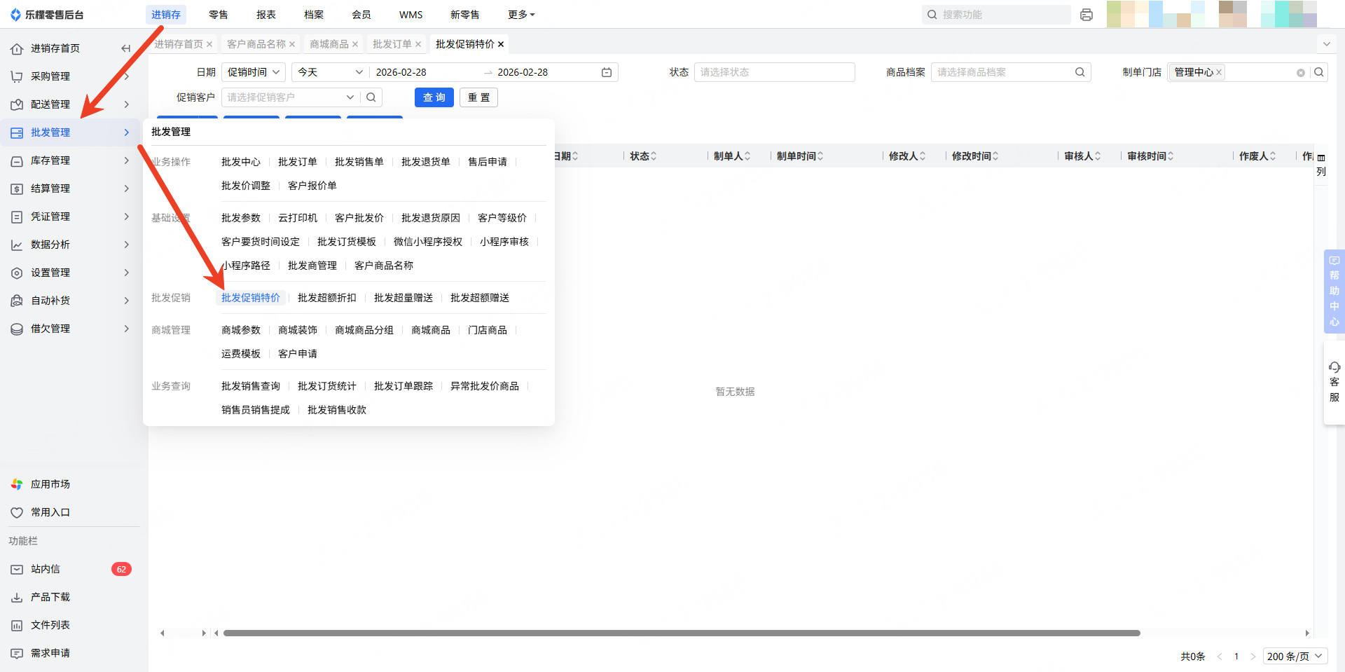 👉【操作路径】:进销存-批发管理-批发促销特价
