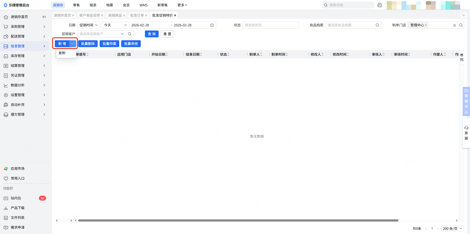 1.点击“新增”按钮进入,创建一张新的批发促销特价单