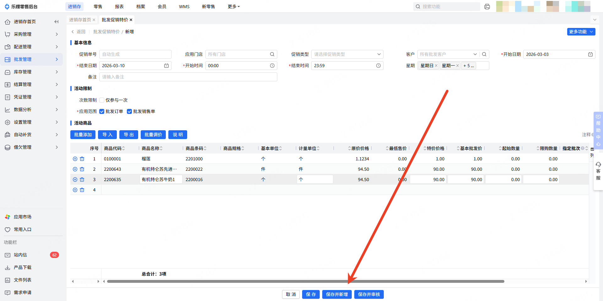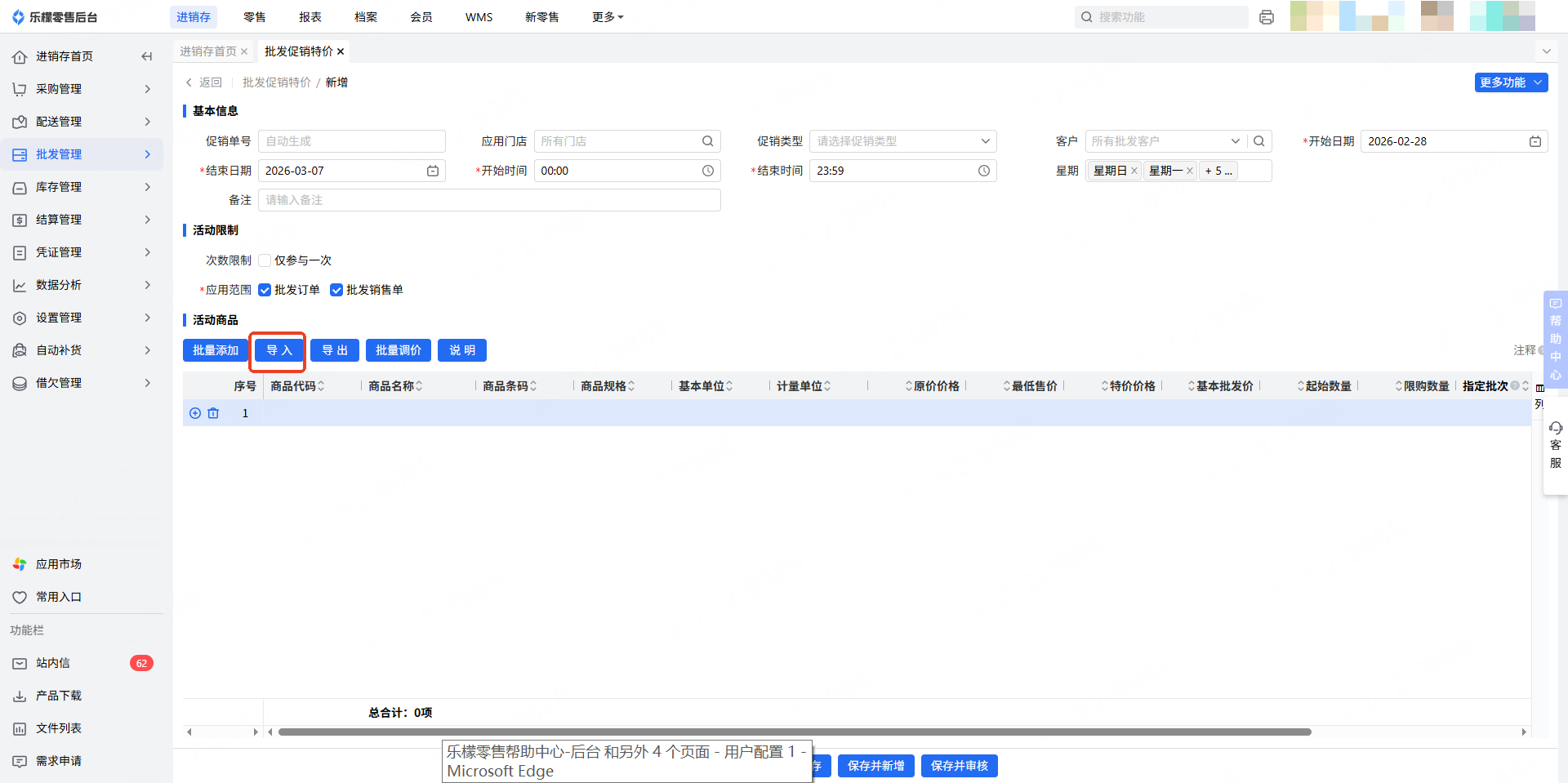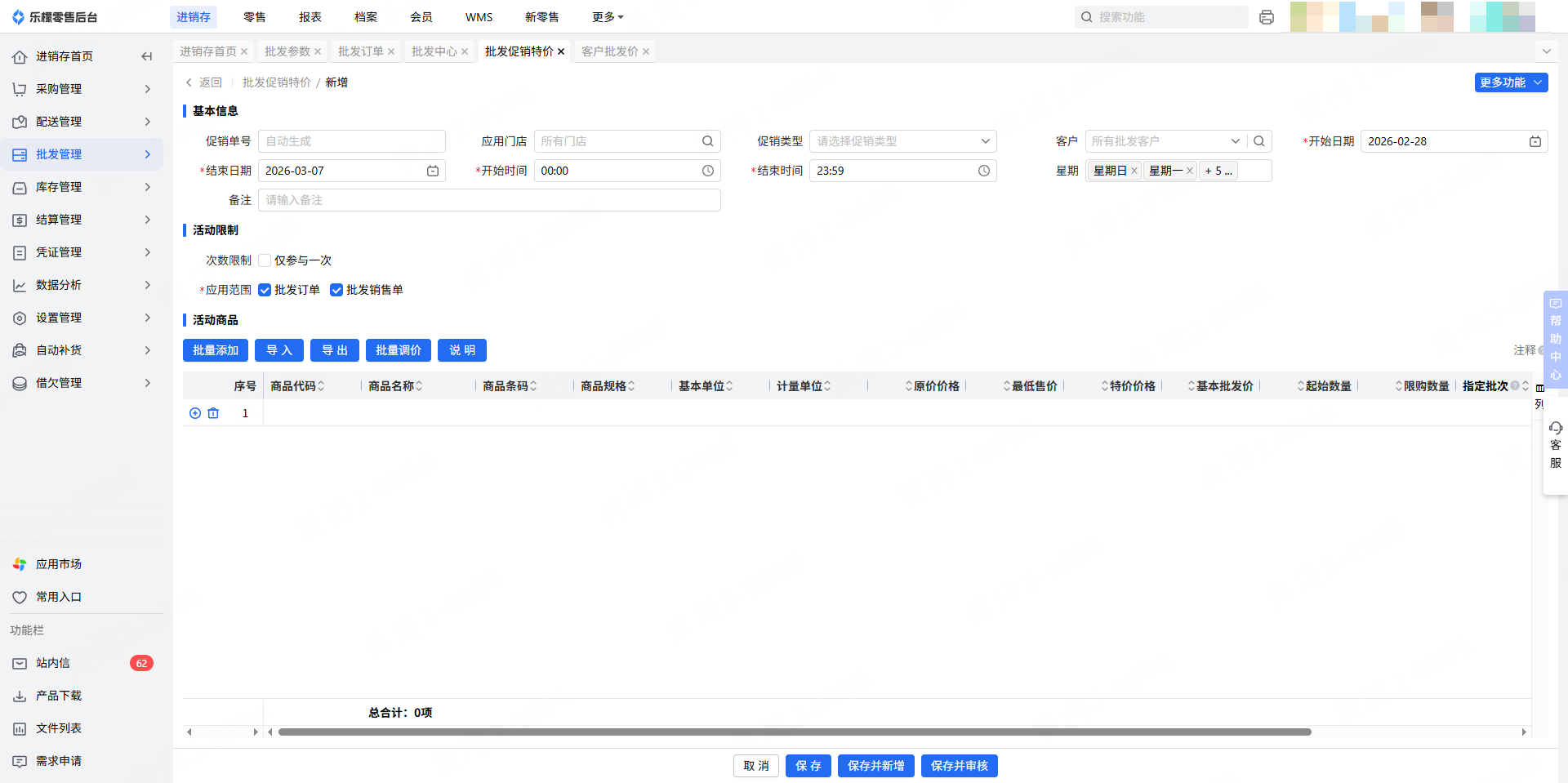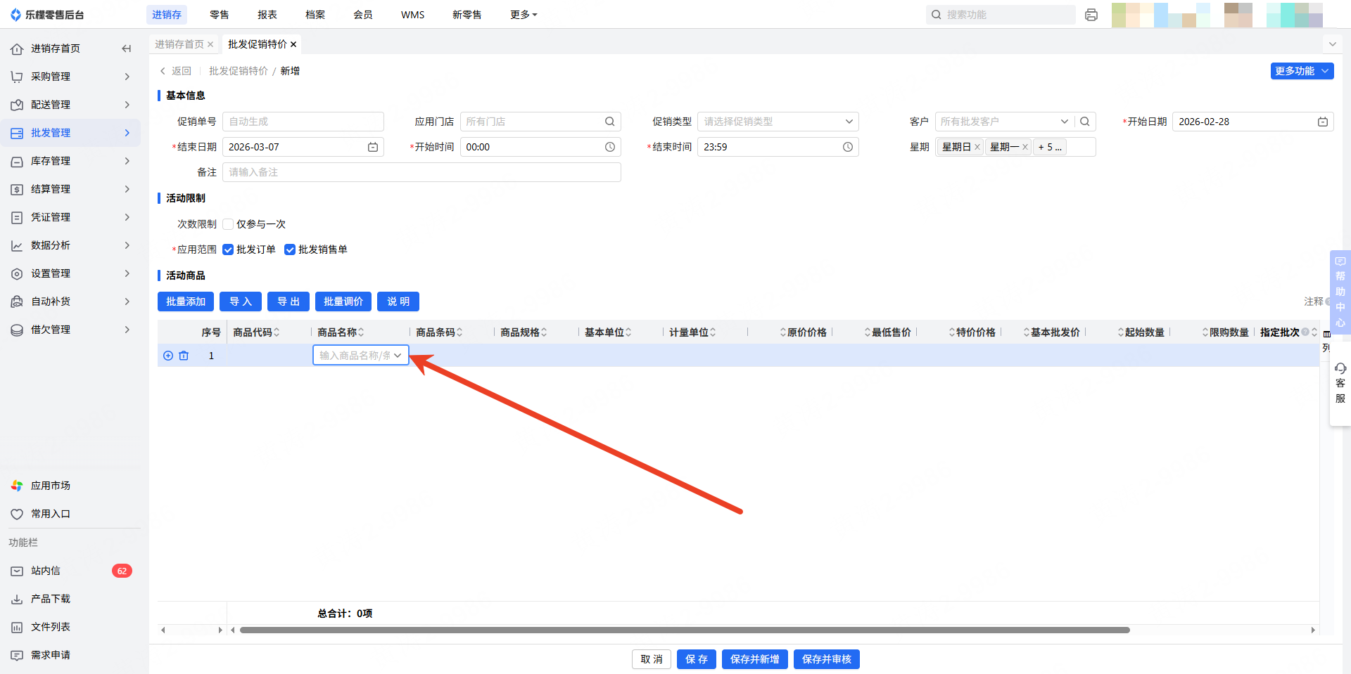 2.进入新增的批发促销特价后,填写基本信息