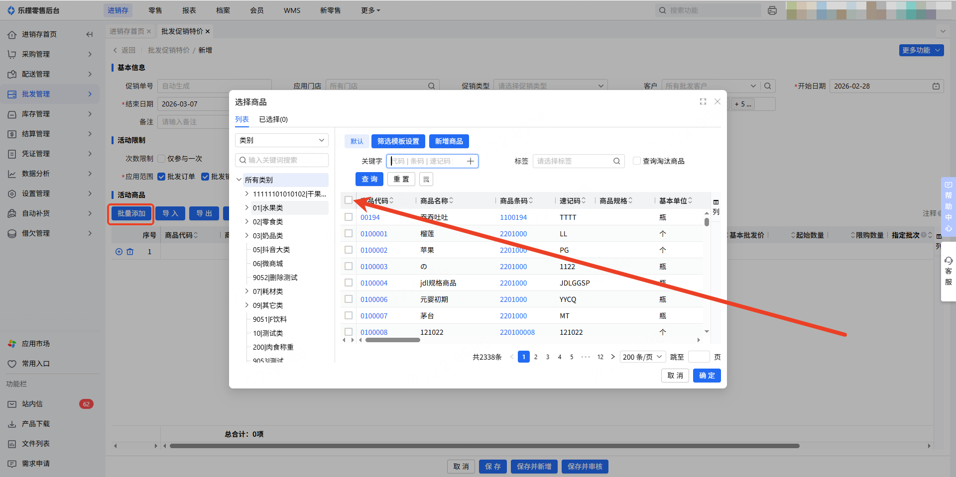3.点击”批量添加“按钮,进行批发促销商品的添加