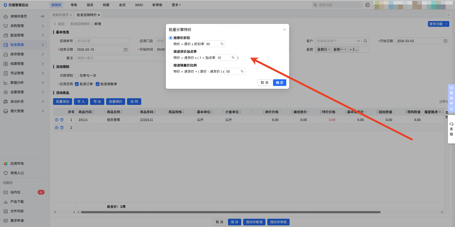 批发促销特价功能,支持为批发客户设置专项促销价格,通过指定特价方案,对批发商品开展优惠促销,提升批发渠道销量。