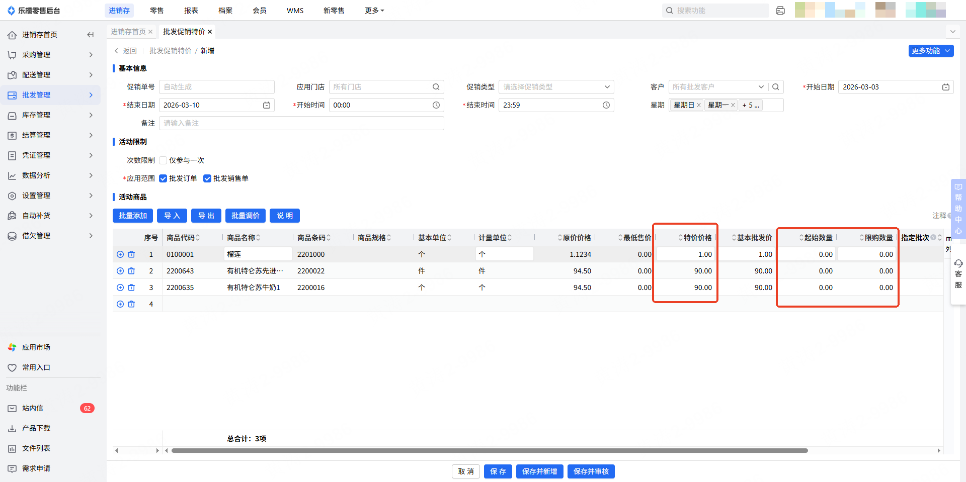 4.添加好相应促销商品后,填写需要特价价格、起始数量以及限购数量。