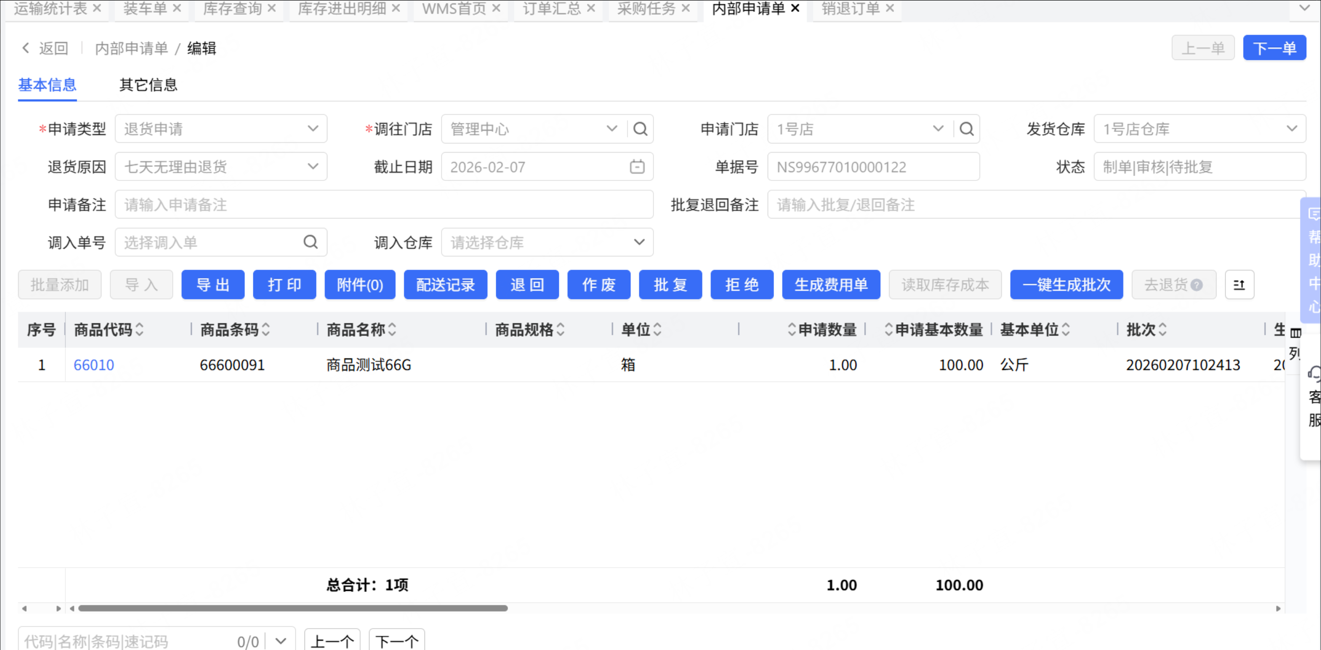 内部申请单,申请数量=1,单位=箱,申请基本数量=100,基本单位=公斤