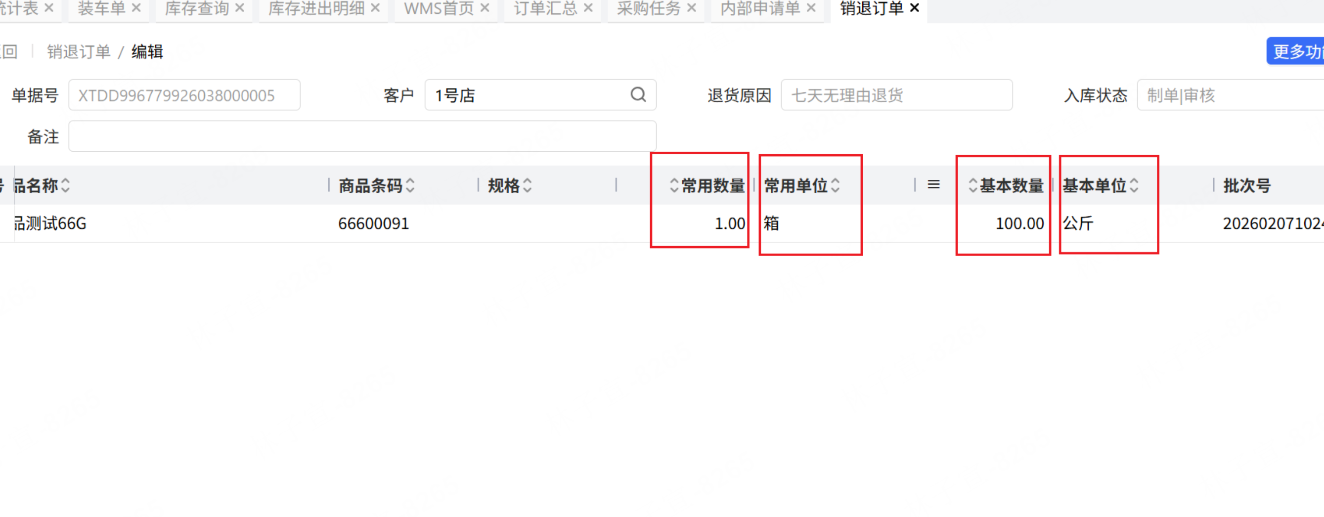 新WMS销退订单查看路径:新WMS-销退订单-进入对应单据-单据明细页-查看“基本数量”“基本单位”“常用单位”“常用数量”(均取自内部申请单,不可修改)