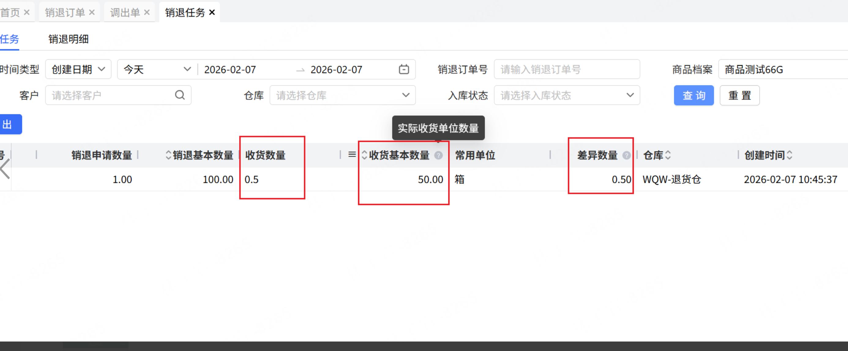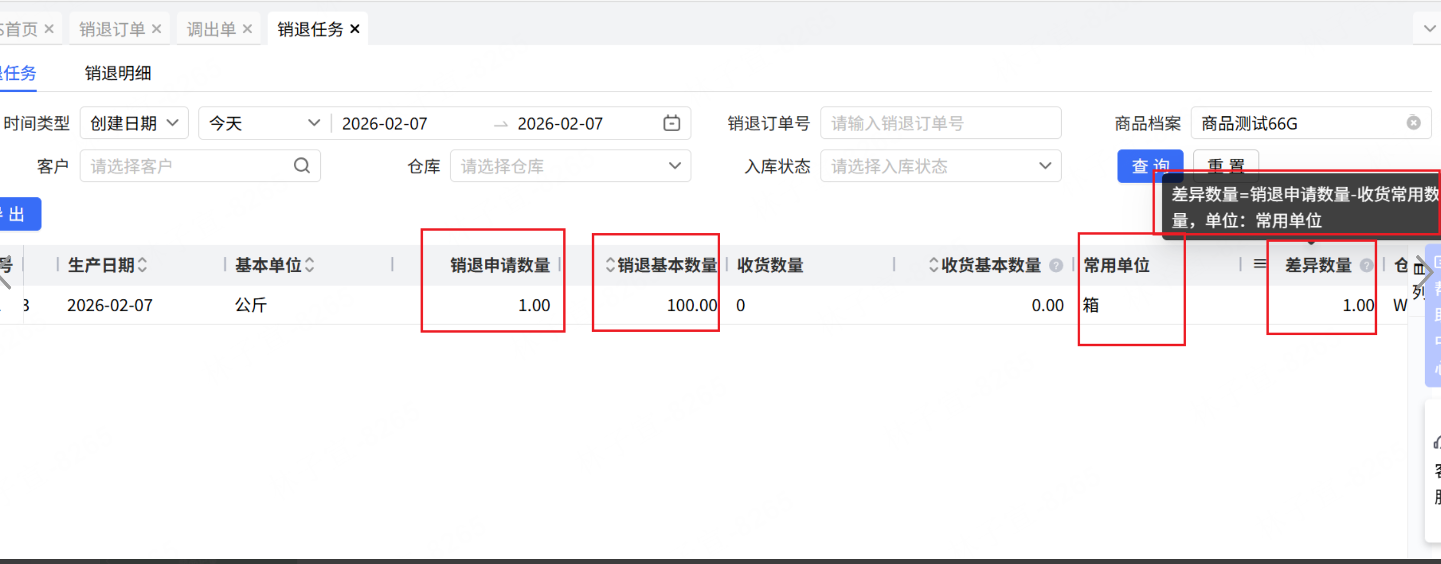 新WMS-销退任务-销退任务tab改造:将原有“退货数量”字段名称修改为“销退基本数量”;将原有“收货数量”字段名称修改为“收货基本数量”;新增“收货数量”列;新增“常用单位”列;新增“销退申请数量”列;优化差异数量计算公式,差异数量=销退申请数量(常用单位)-收货数量(常用单位)