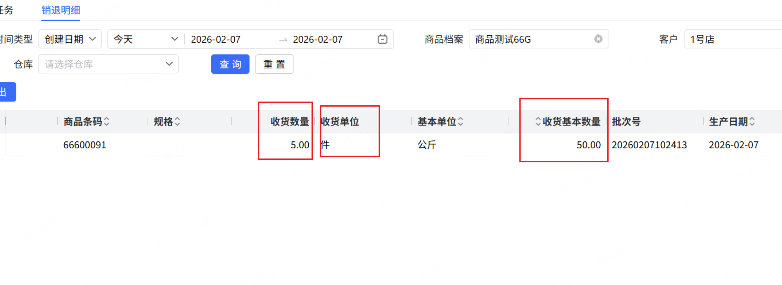 销退任务-销退明细tab,收货单位=件(实际提交单位),新增“收货数量”列,收货数量=5(实际提交数量),收货基本数量=50