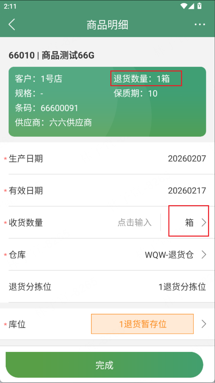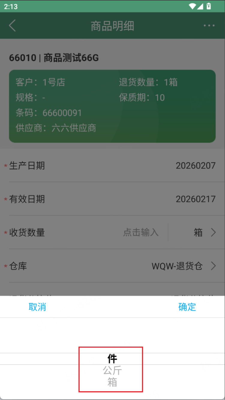 仓配App收货时,收货数量默认按常用单位录入,可切换其他单位,切换后系统会自动按换算率同步基本单位数量,无需手动换算。