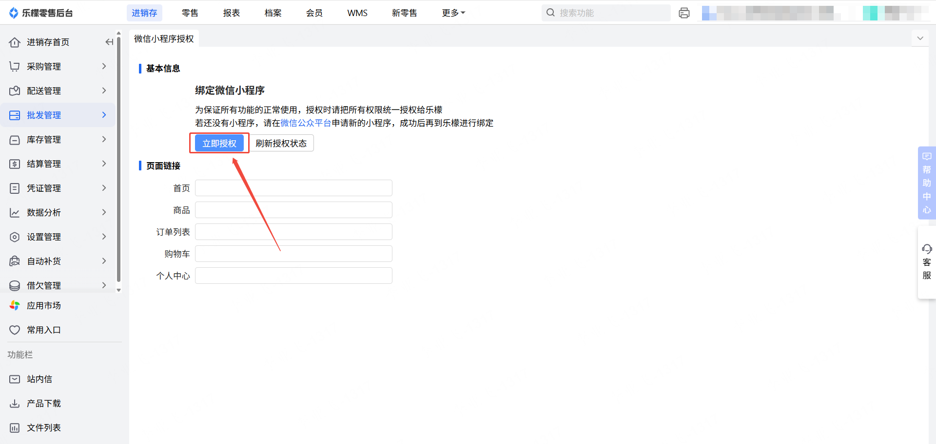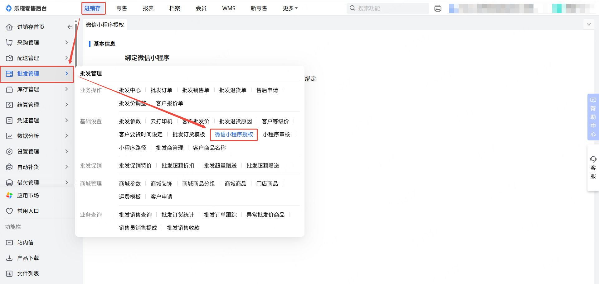 👉【操作路径】:进销存-批发管理-微信小程序授权