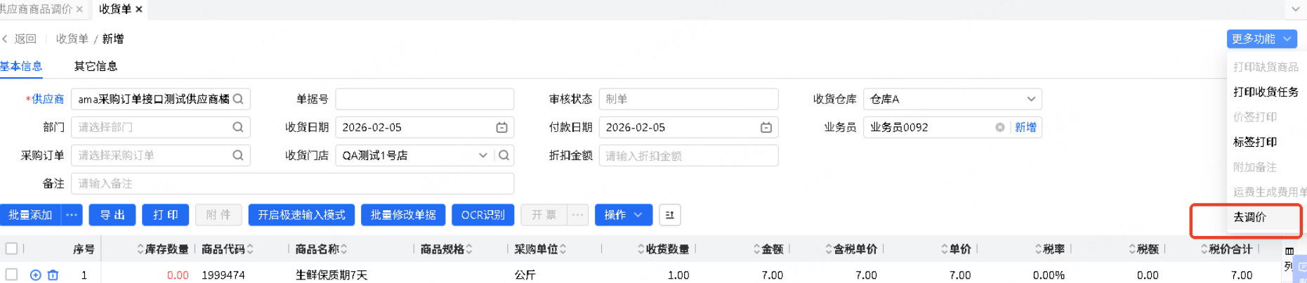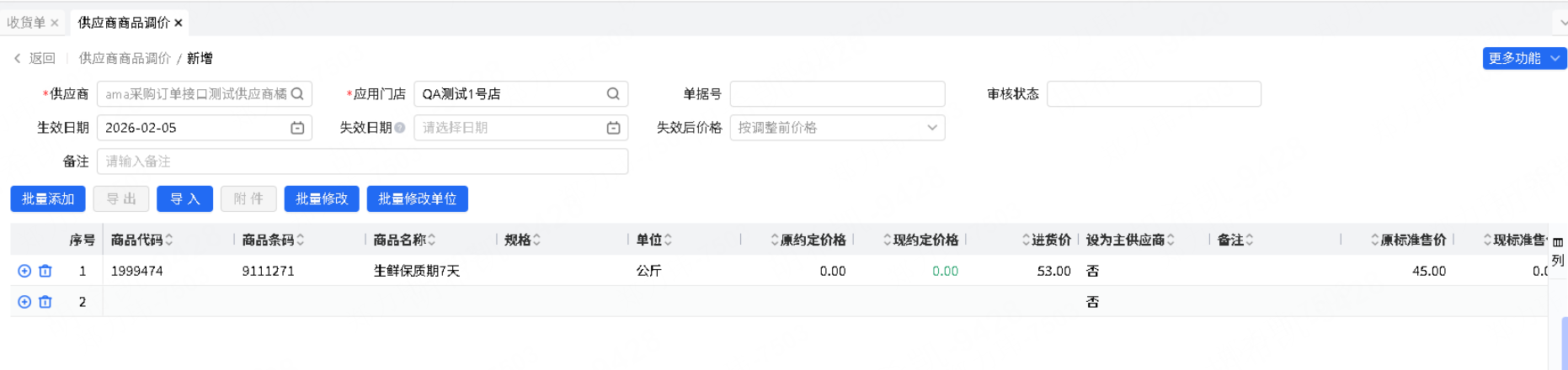 点击后,跳转至“供应商商品调价”界面,将对应收货门店、商品带入至详情页