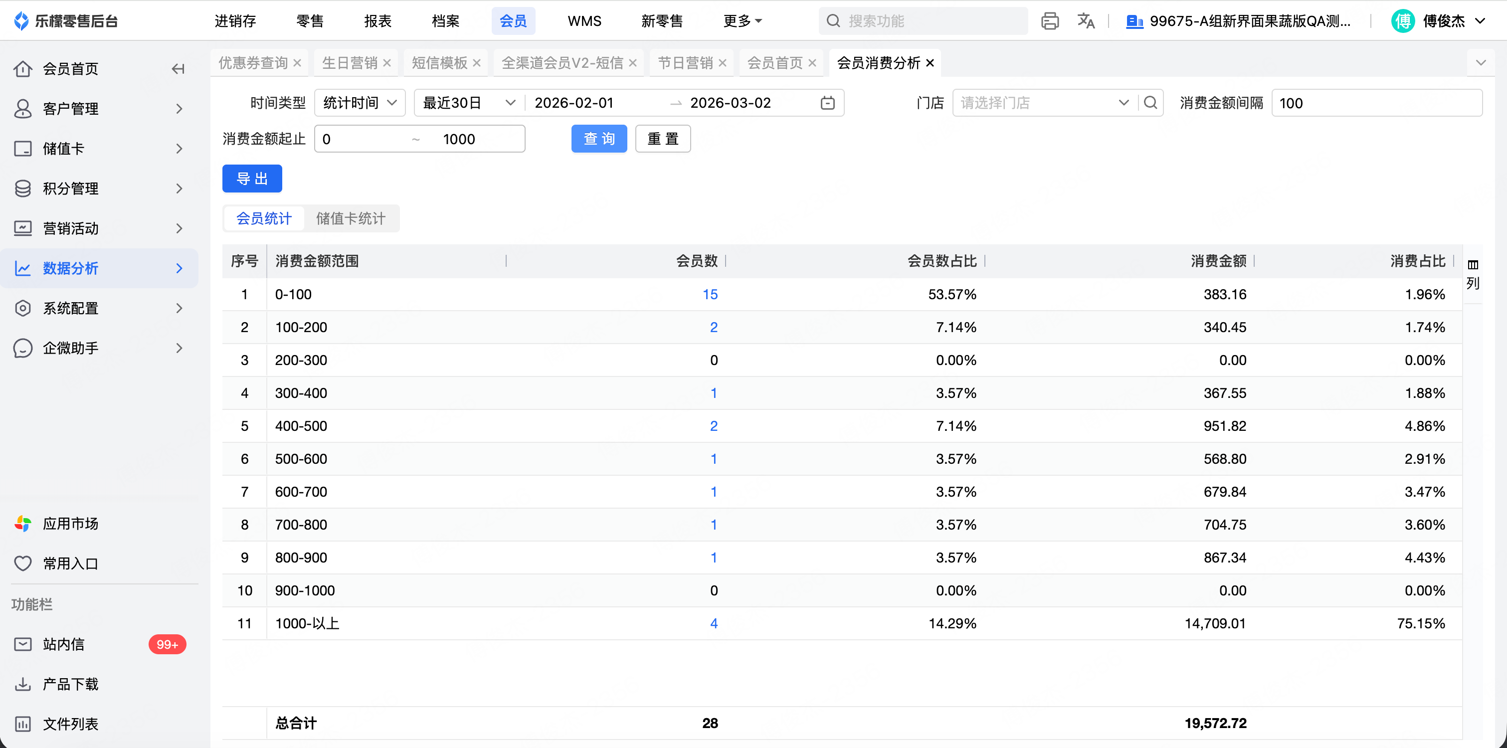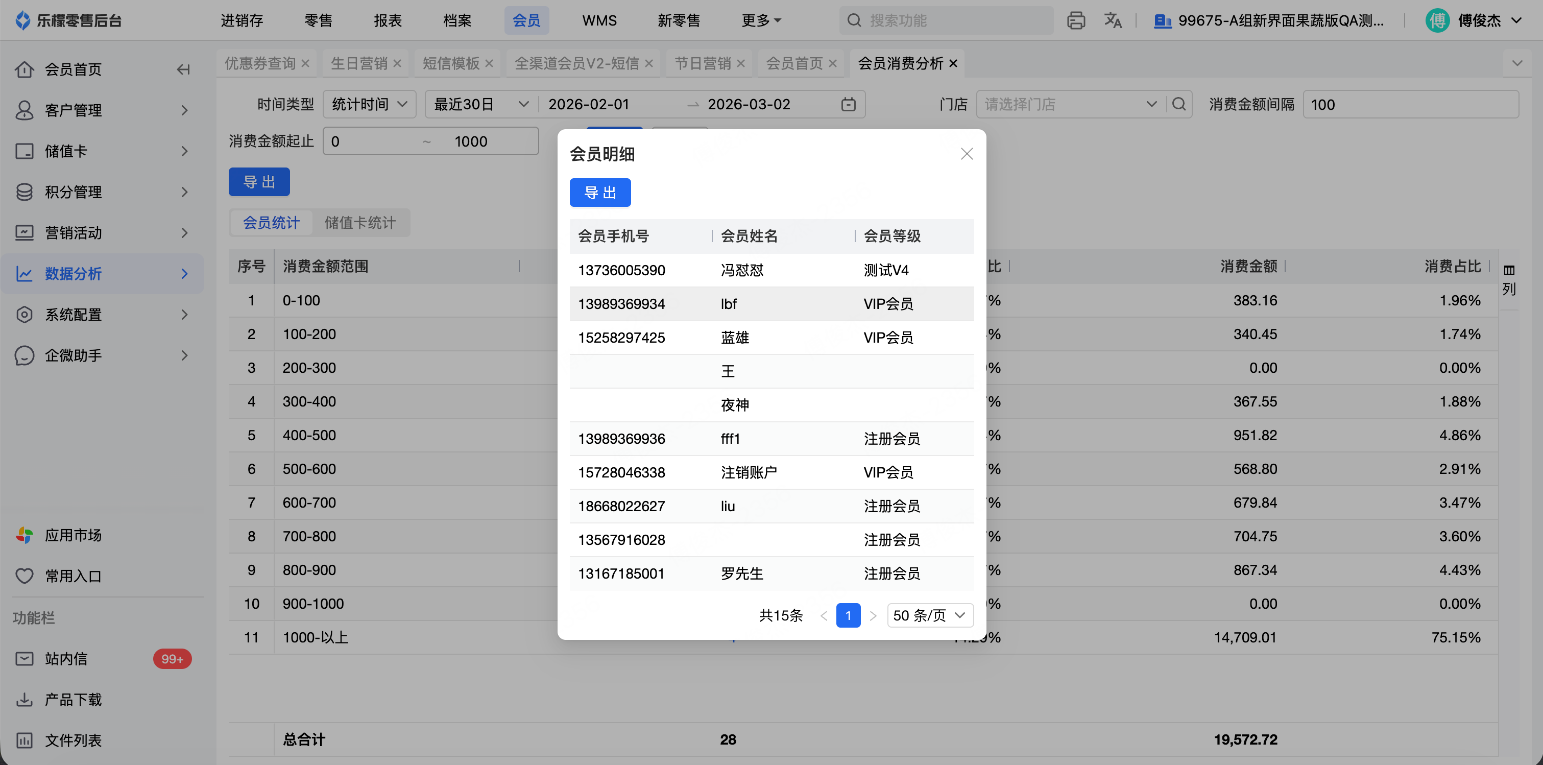 客户反馈:目前再会员消费查询中可以快速统计,每个消费金额阶梯中,会员数有多少,但是无法点击查看明细