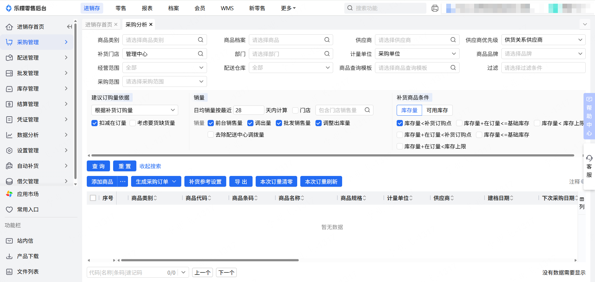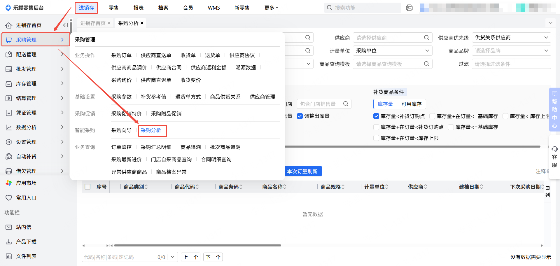 2、采购分析-采购商品条件,库存量<库存上限 不生效,采购分析里查询不到需要补货的商品