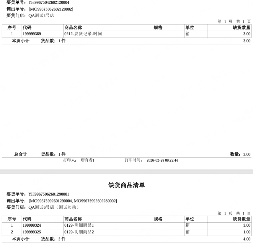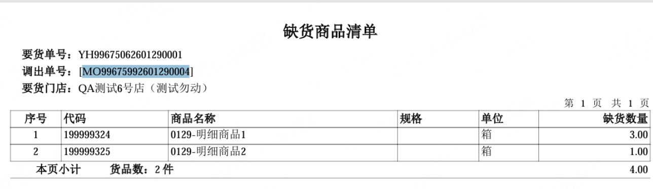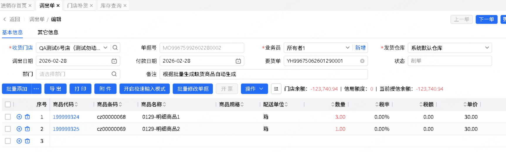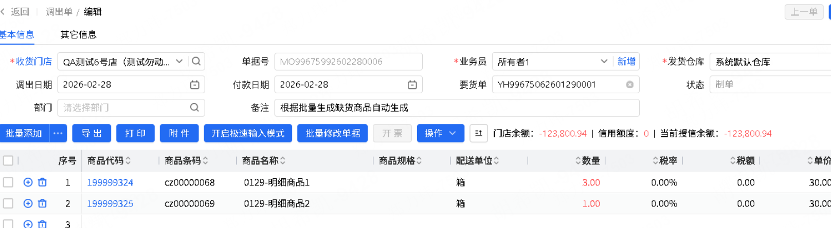按照:对应单据中商品缺货数量生成一张制单状态的调出单
