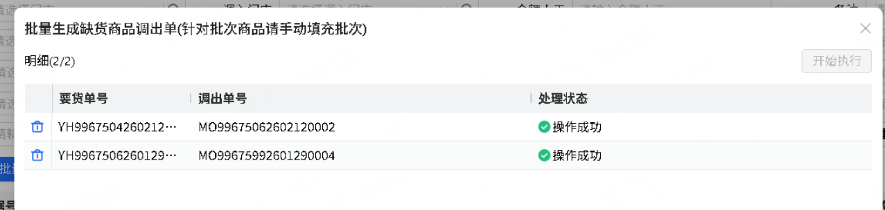 支持多选,弹窗需要展示要货单号,按照逐一生成新单据的方式执行(1张要货单可能关联多张调出单,则统一数量生成)