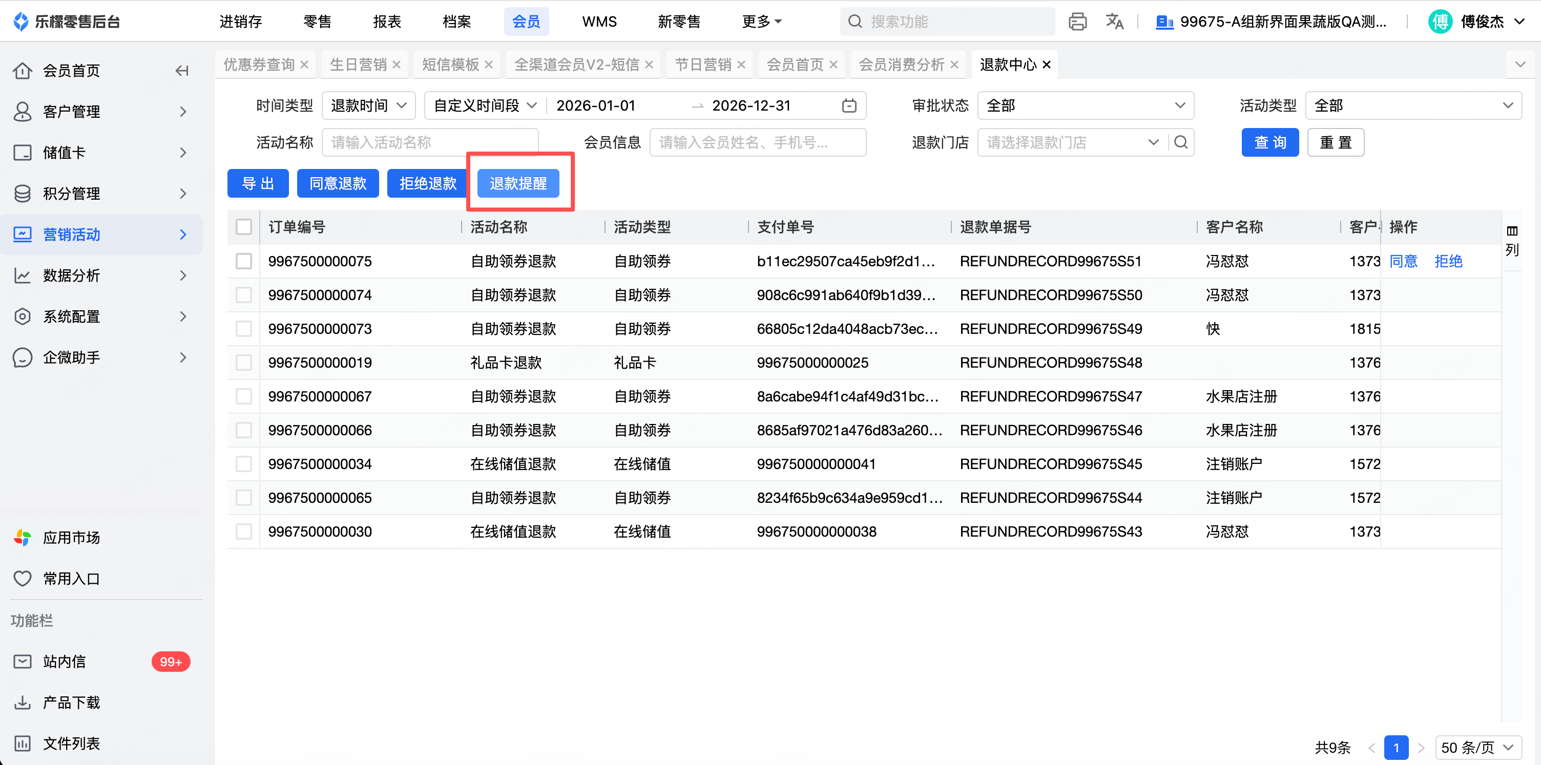 客户反馈:目前会员板块-退款中心,顾客线上充值申请退款,后台收不到提示,导致总部处理不即时,给顾客的体验感不好