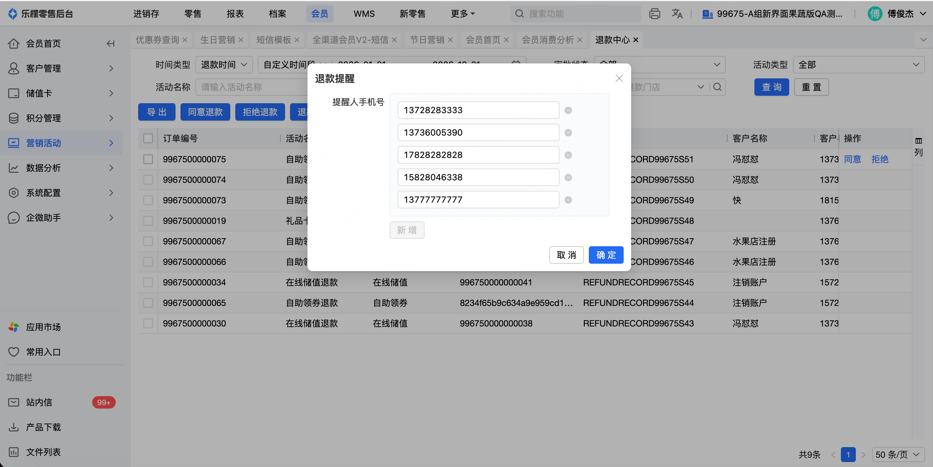 全渠道会员-退款中心,新增「退款提醒」按钮,点击后可设置至多5个提醒人,在退款中心产生新的待处理的退款请求后,将会发送短信至指定提醒人名下