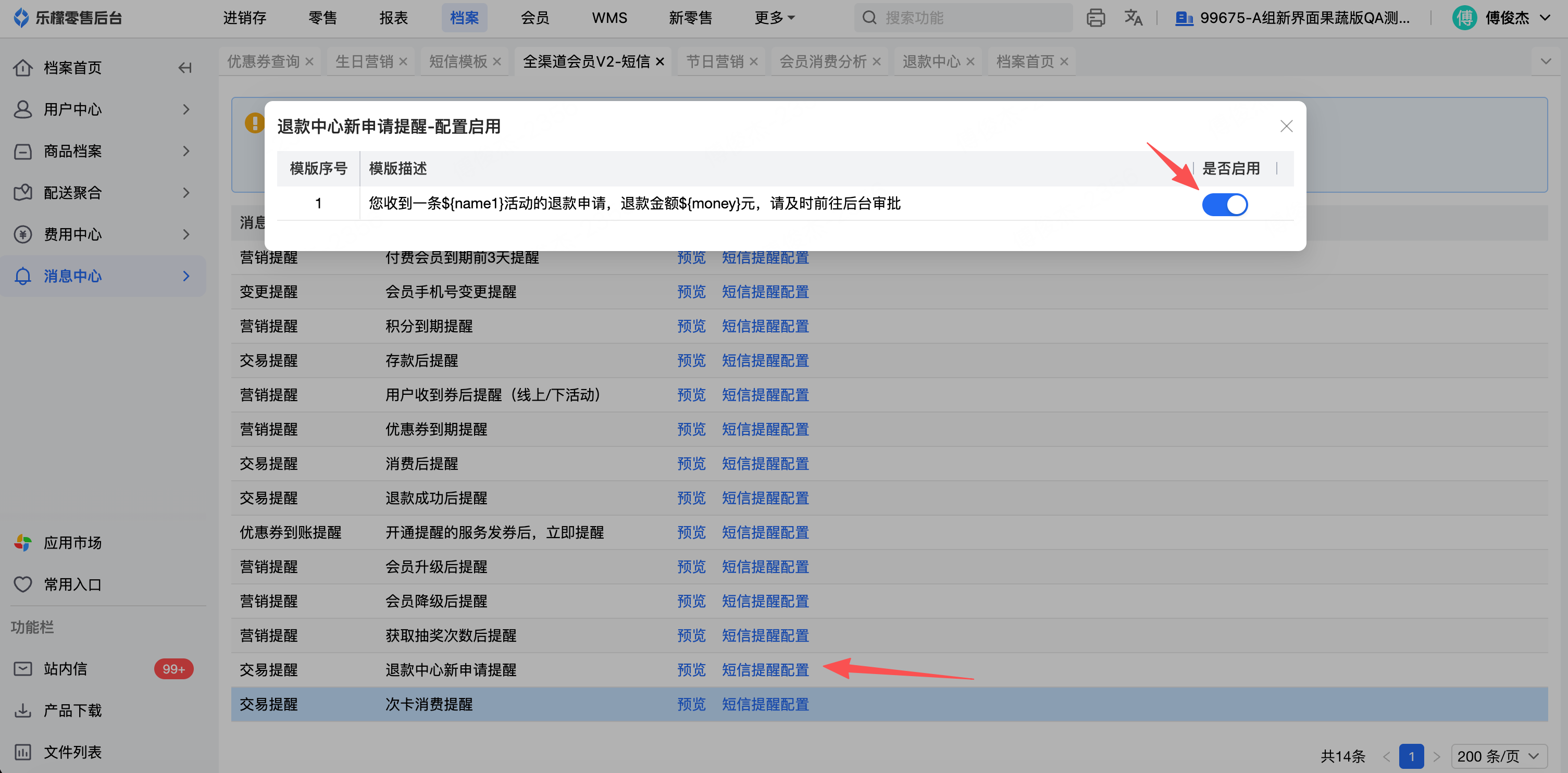 注意,在发送短信提醒前,请确认您在消息中心中已开启了对应的退款短信模板