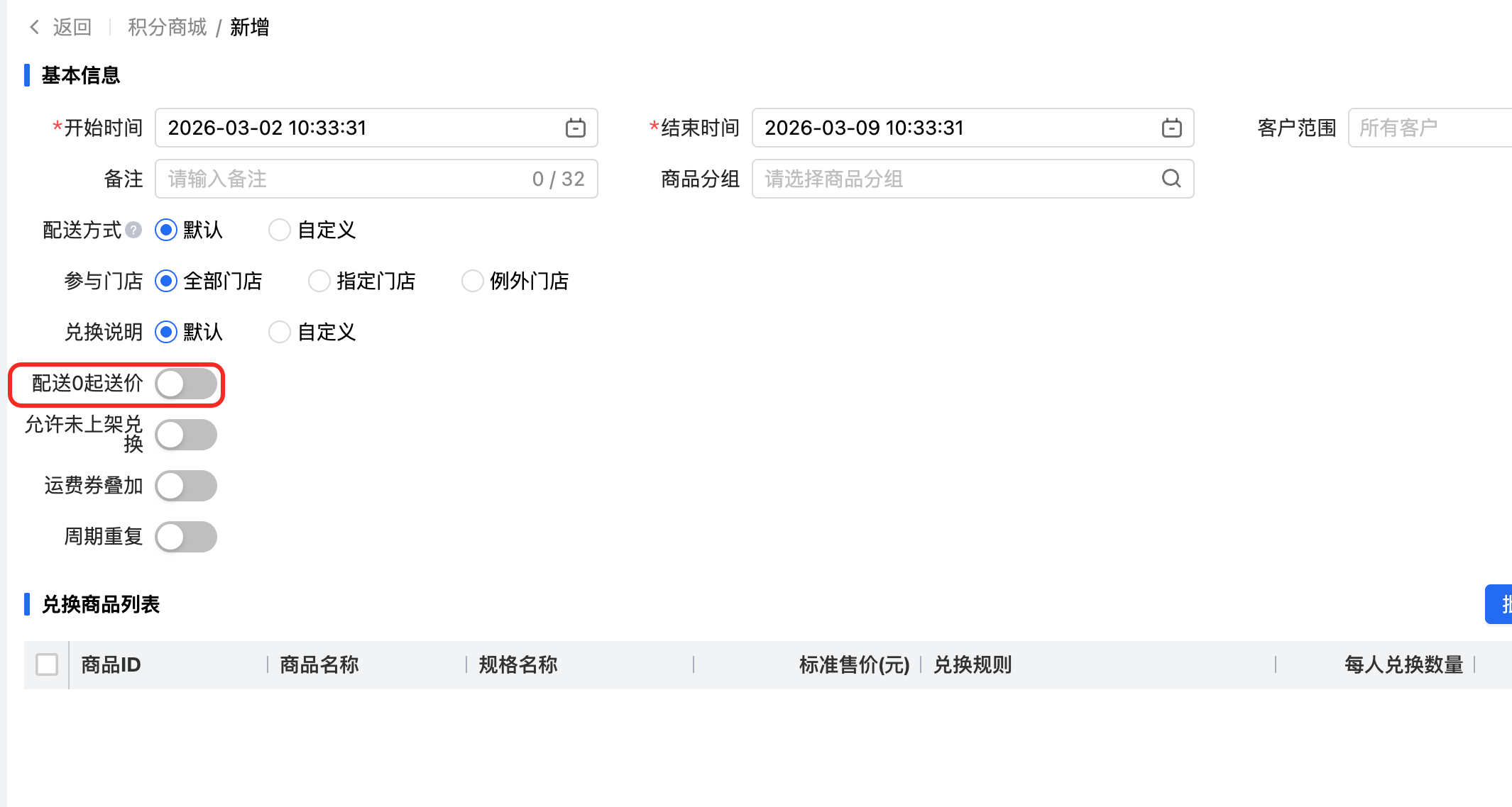 积分商城,积分兑商品增加【配送0起送价】参数,开启后,积分商品配送订单,不满起送价也可下单,配送费按仍然按现有规则收取