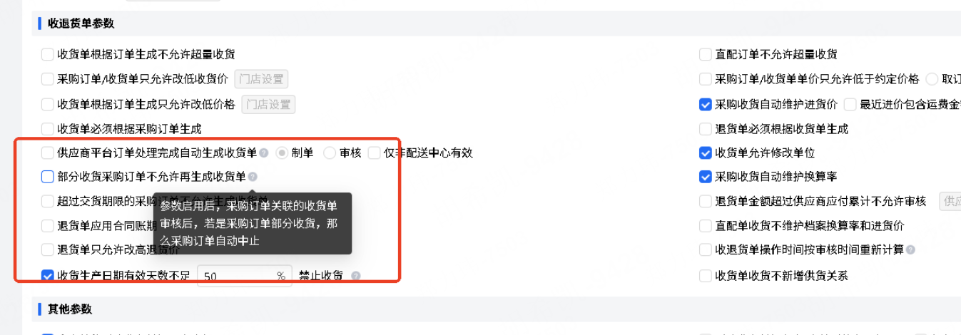 参数增加注释:参数启用后,采购订单关联的收货单审核后,若是采购订单部分收货,那么采购订单自动中止