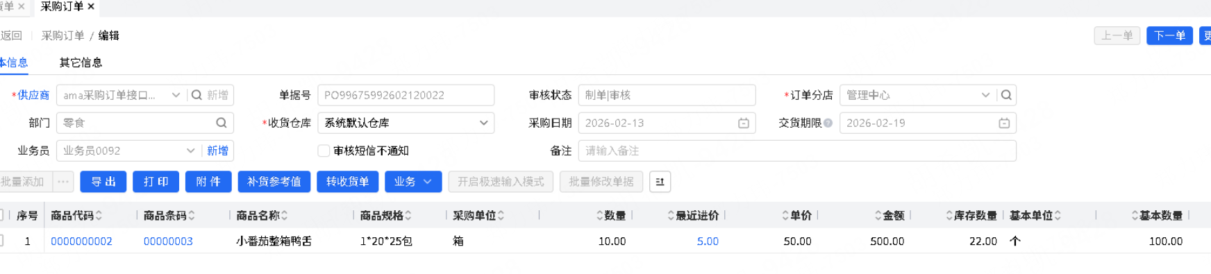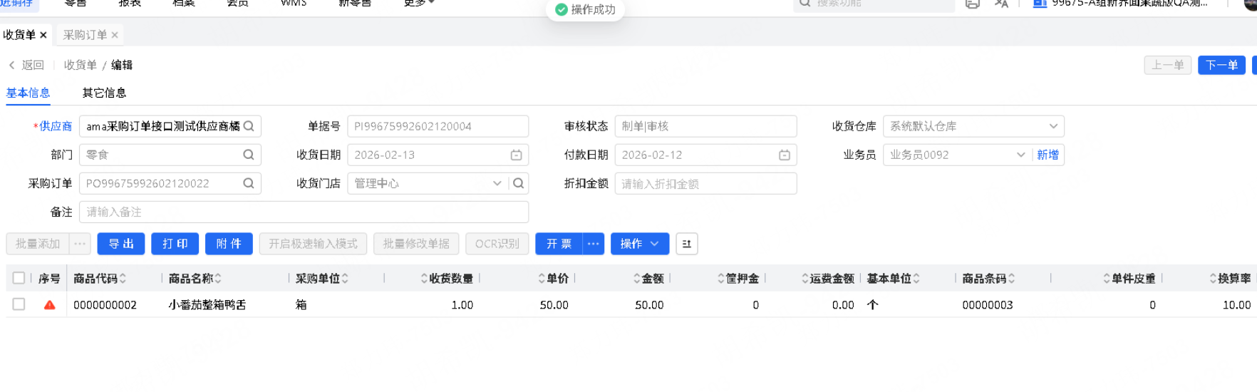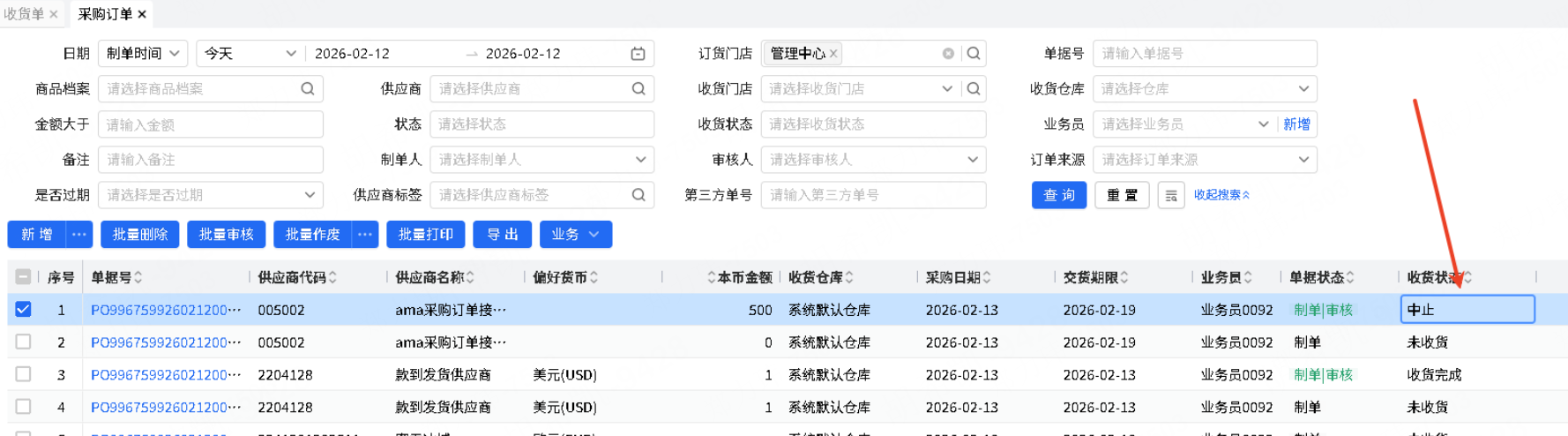 参数“部分收货采购订单不允许再生成收货单”开启时,采购订单关联的收货单审核后,若是采购订单部分收货,采购订单自动中止。