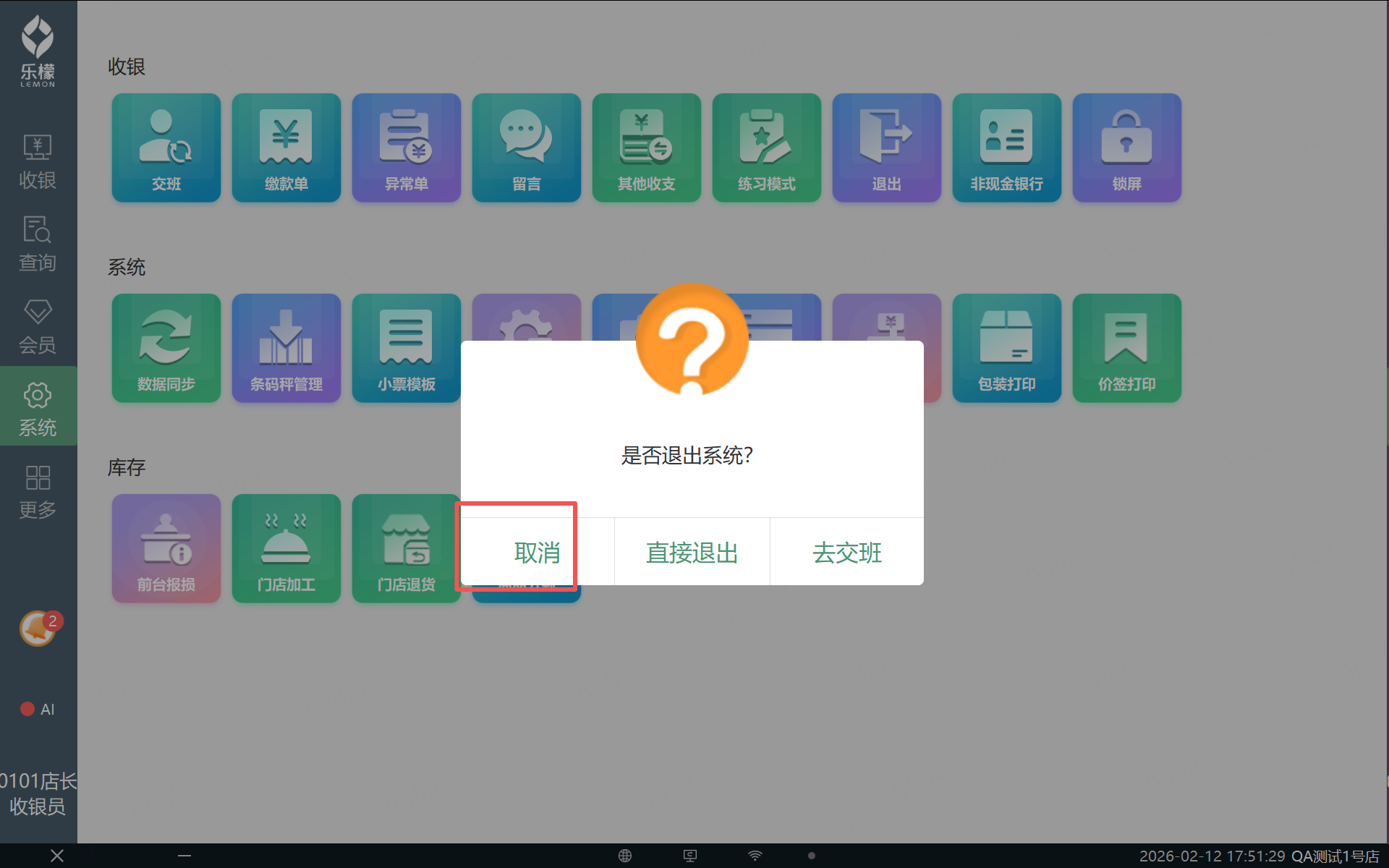 点击左下角【X】或者点击更多功能–退出时,系统弹窗提示:“是否退出系统?”【取消】【直接退出】【交班并退出】