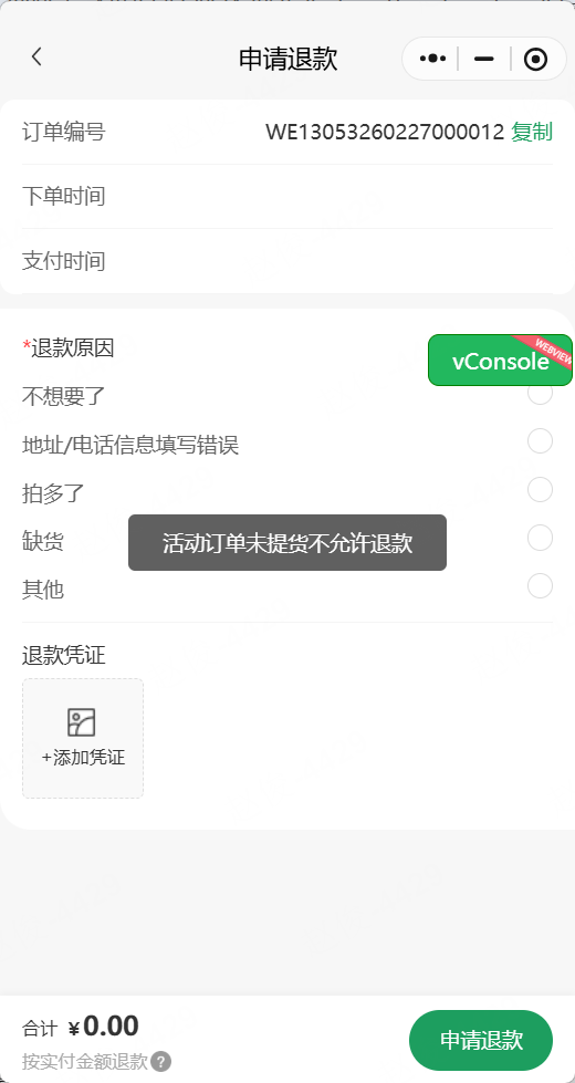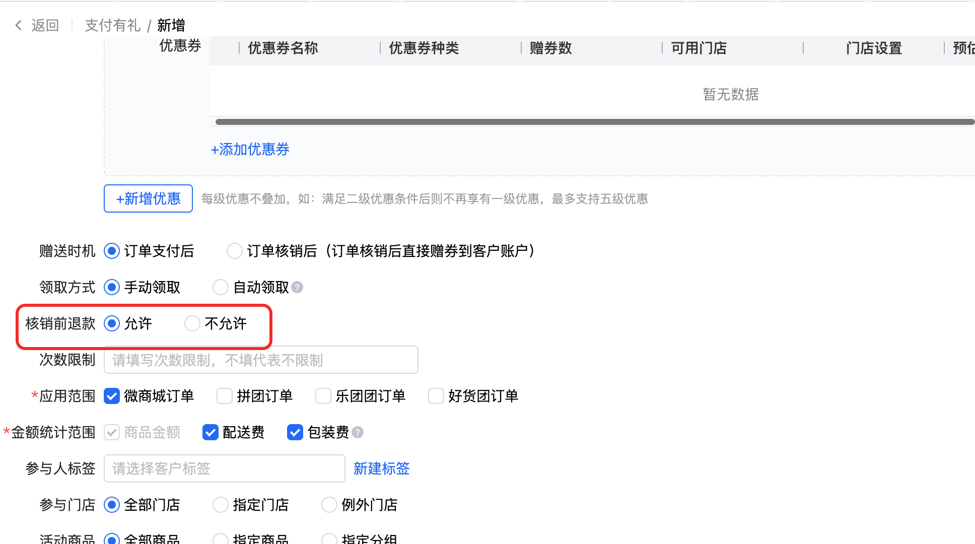 如果选择不允许,则小程序端享受该支付有礼活动的订单,核销前不允许退款。小程序端点击退款提示:活动订单未提货不允许退款