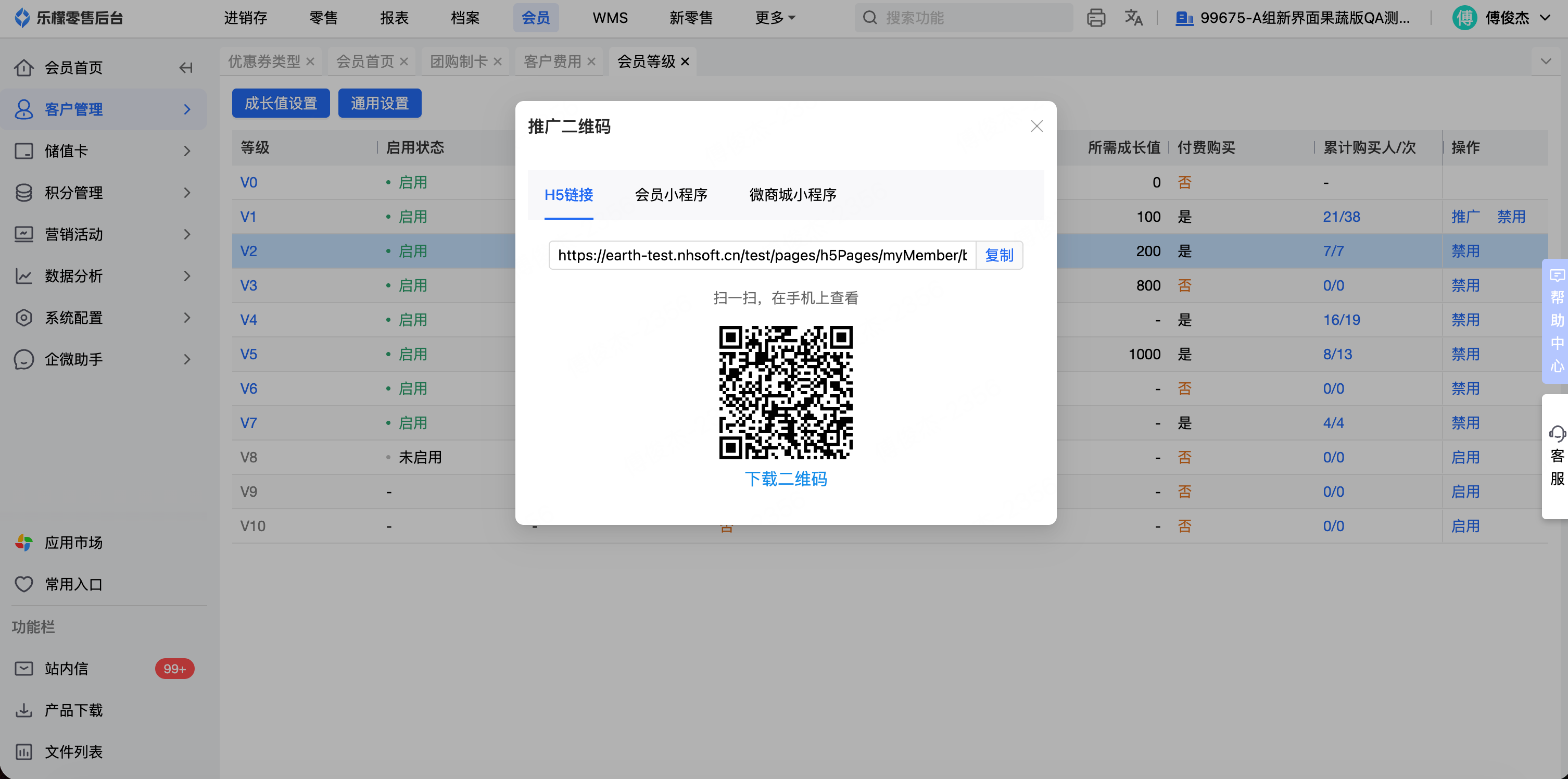 1、会员等级新增「推广」按钮,点击后将展示H5、会员/新零售小程序对应的推广二维码