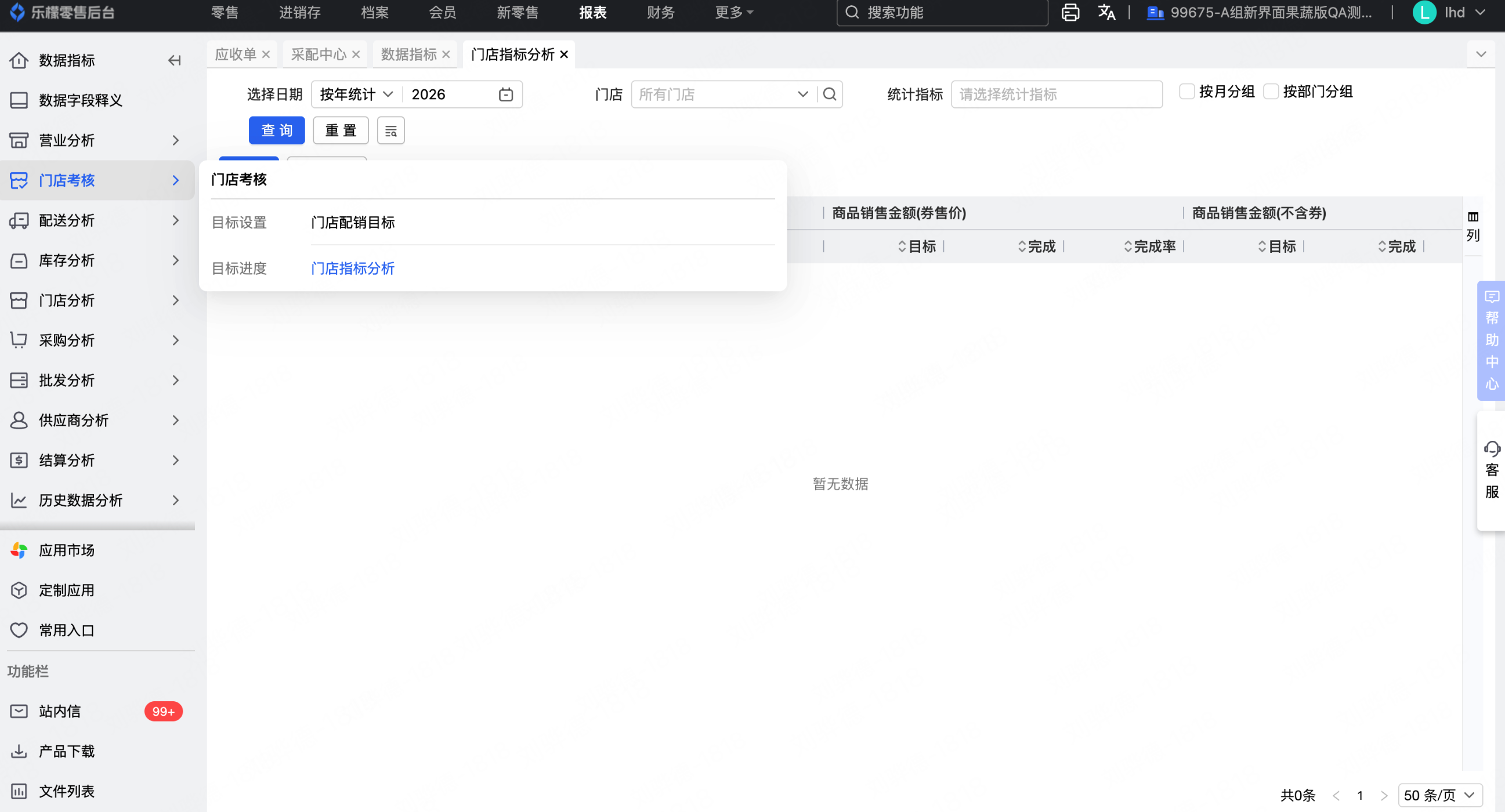 将门店配销目标、门店指标分析,统一放到“基础管理”二级菜单,调整二级菜单名称为“门店考核”放在营业分析下方,后续迭代其他维度门店考核报表。