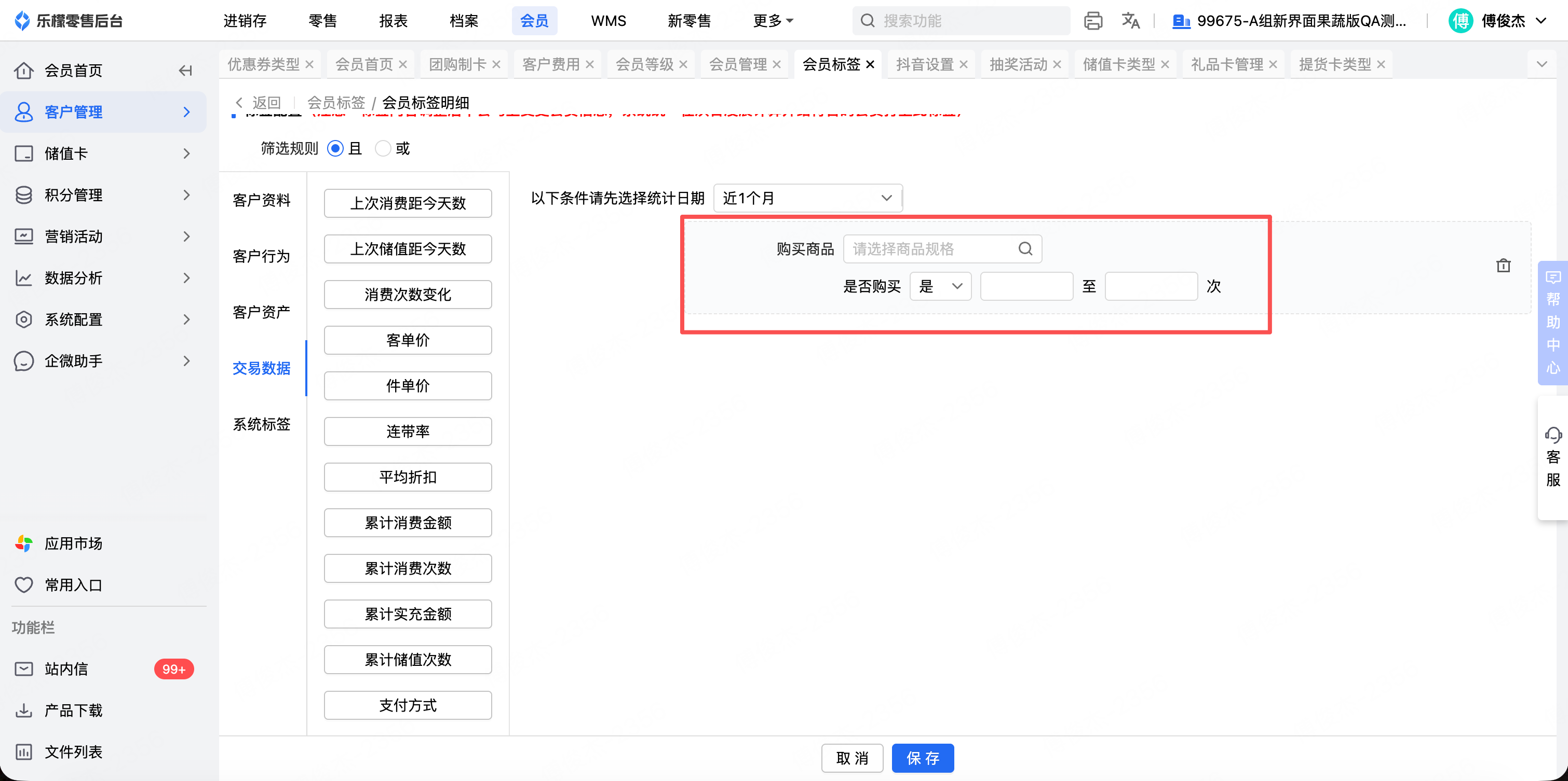 4、会员标签:交易数据-购买商品的商品选择弹窗,由原先的主商品修改为单规格商品